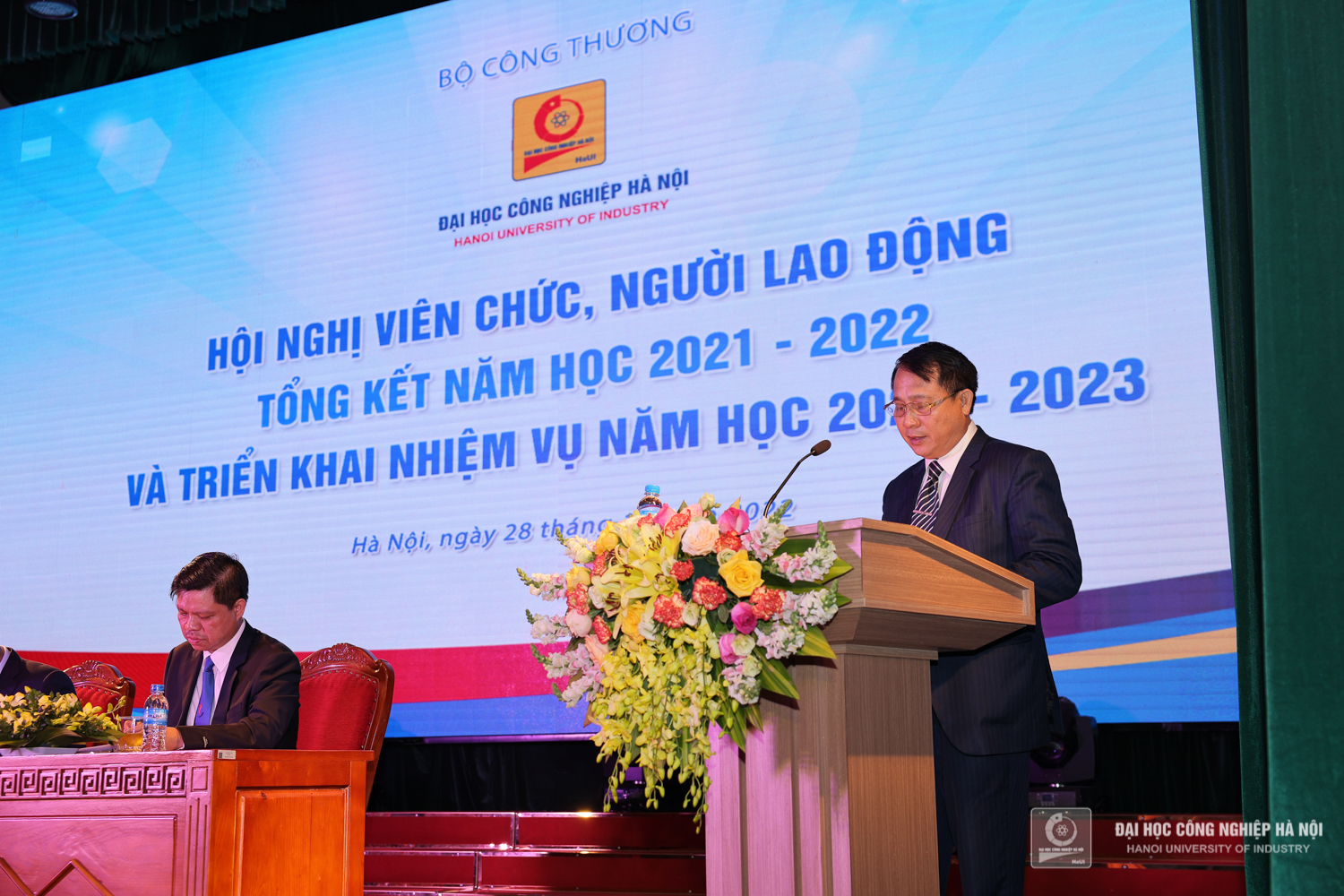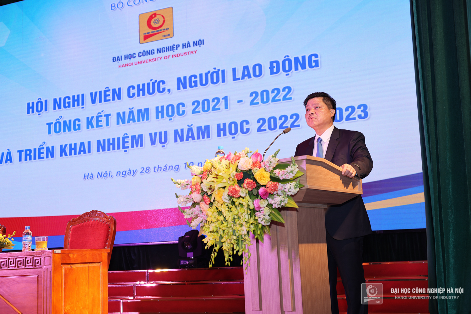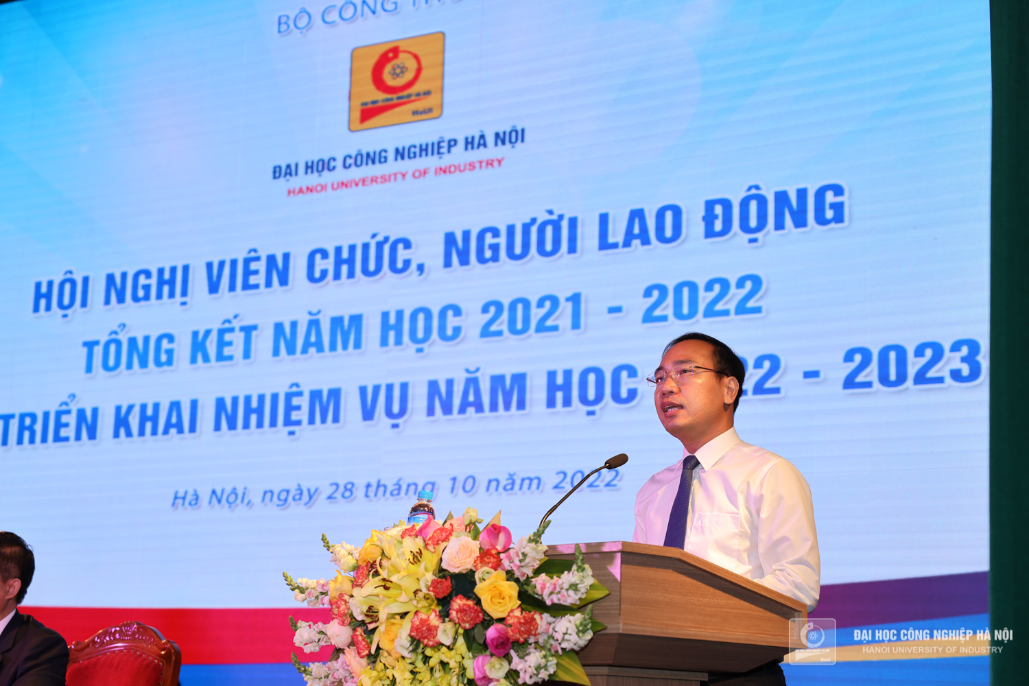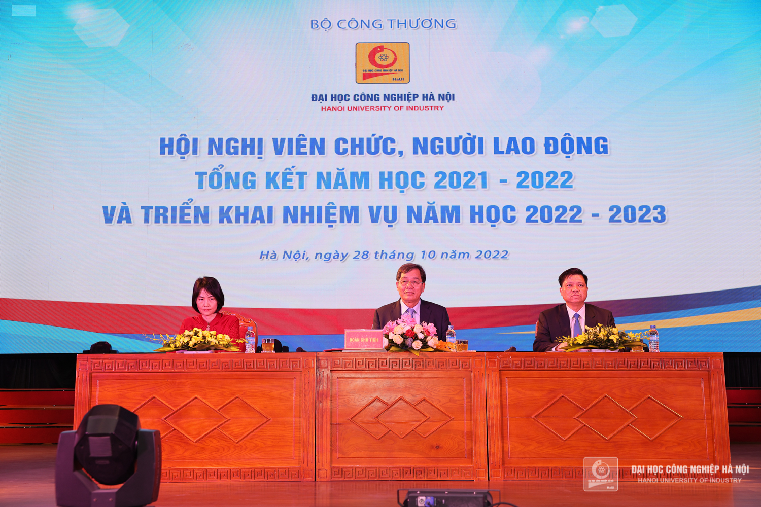 Sáng ngày 28/10, Trường Đại học Công nghiệp Hà Nội tổ chức Hội nghị viên chức, người lao động, tổng kết năm học 2021 – 2022 và triển khai nhiệm vụ năm học 2022 – 2023. PGS.TS.Trần Đức Quý - Bí thư Đảng ủy, Hiệu trưởng nhà trường; PGS.TS.Phạm Văn Đông, Chủ tịch Công đoàn trường chủ trì Hội nghị.