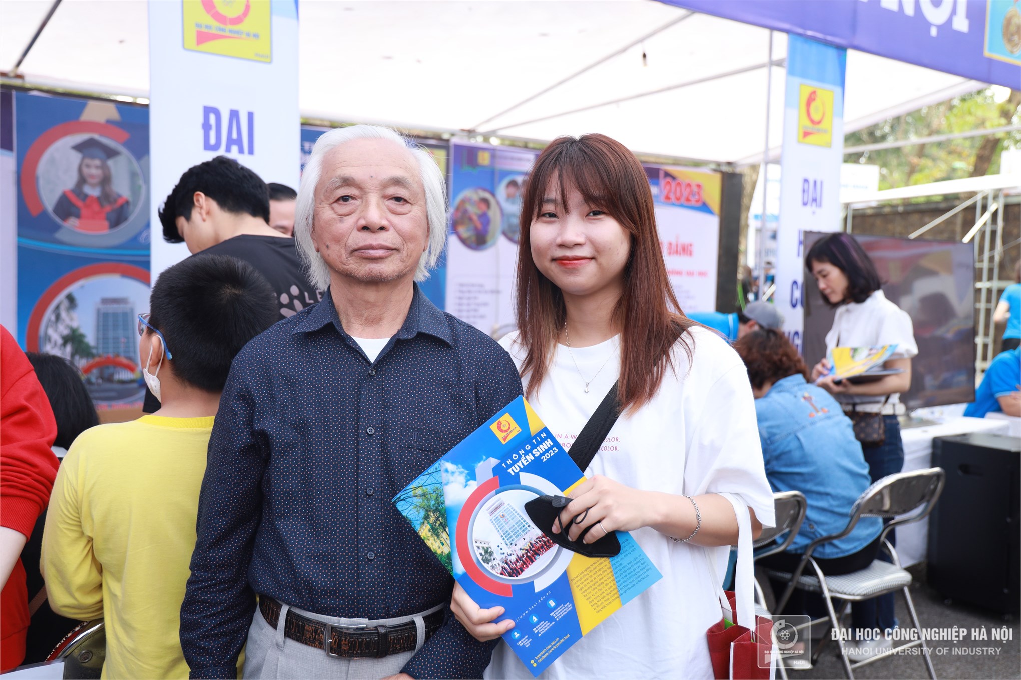 Ông Bùi Phước Lợi, 81 tuổi cùng cháu nội Bùi Thị Phước Loan (THPT Gia Viễn – Ninh Bình) phấn khởi sau khi được tổ tư vấn Đại học Công nghiệp Hà Nội giải đáp thắc mắc về ngành Ngôn ngữ Anh. Ông Lợi cho biết: Hai ông cháu lên nhà người quen ở từ tối qua, sáng nay ra tham quan ngày hội từ rất sớm. Nhà ông đã có 1 cháu trai theo học tại Đại học Công nghiệp Hà Nội, nên nay rất yên tâm muốn gửi gắm cháu gái cho nhà trường.