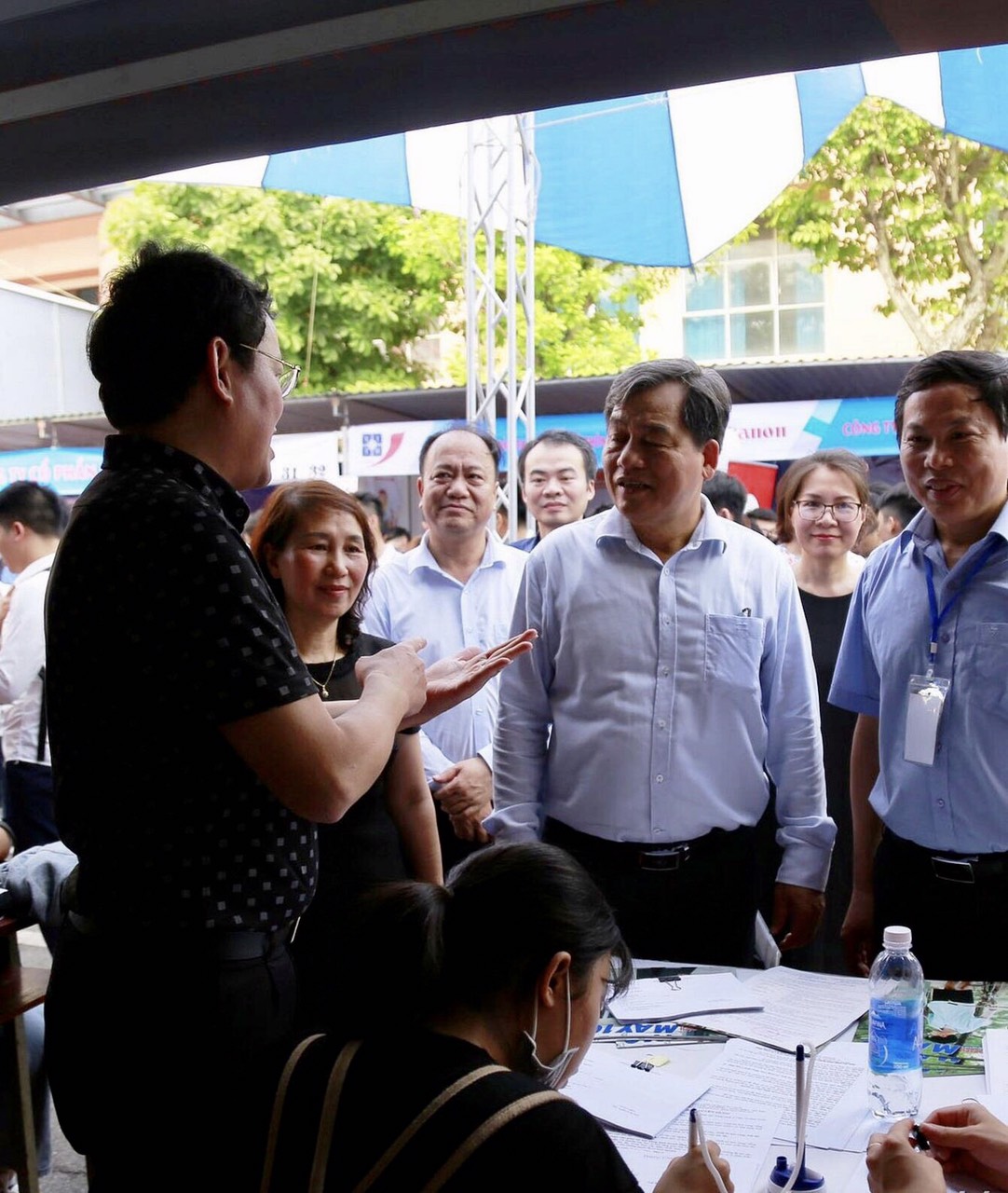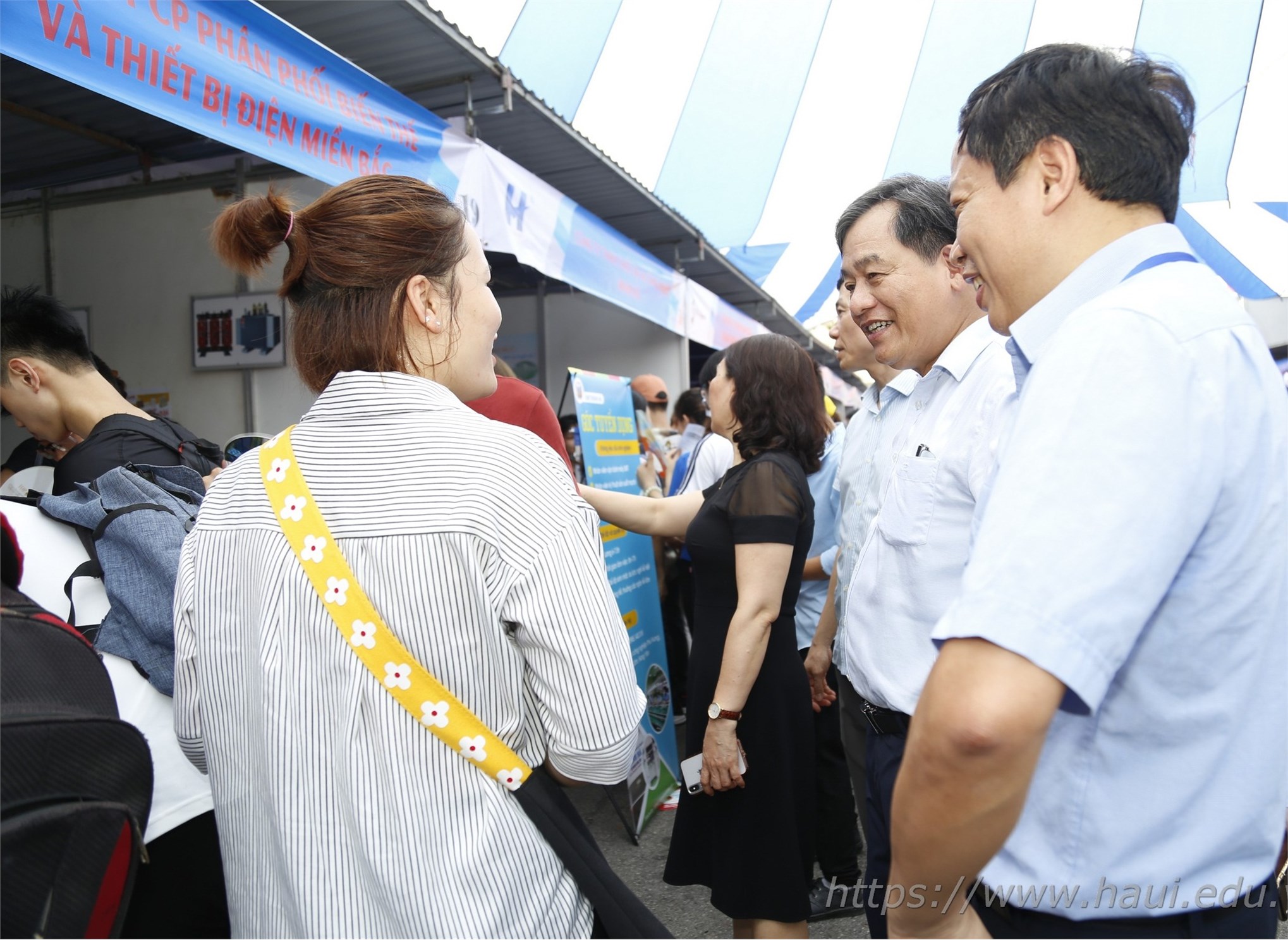 Sau Lễ khai mạc, PGS.TS. Trần Đức Quý - Bí thư Đảng ủy, Hiệu trưởng Nhà trường cùng các thành viên trong Ban Tổ chức đã thăm quan các gian hàng, trao đổi cùng doanh nghiệp và sinh viên tham dự Ngày hội việc làm.