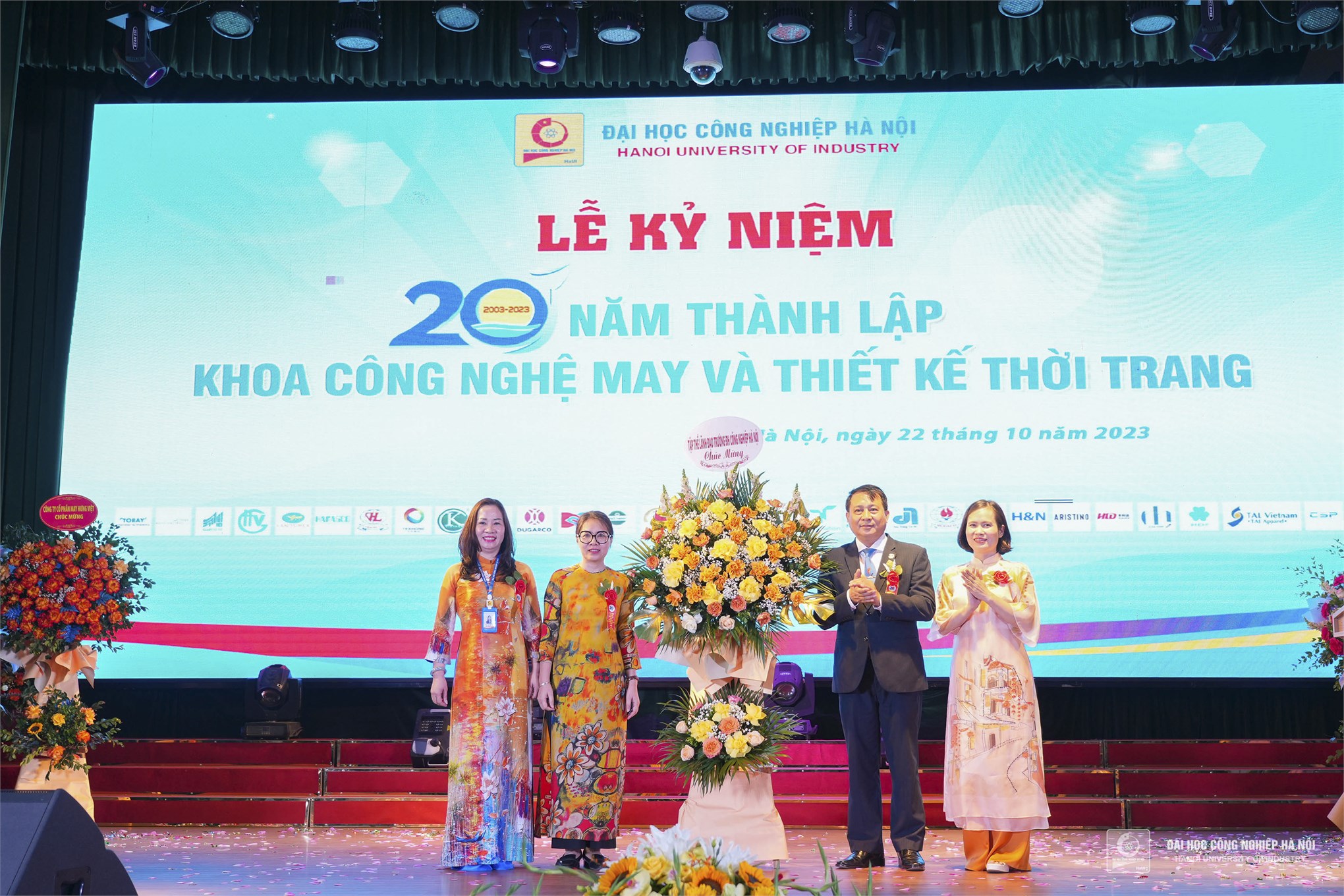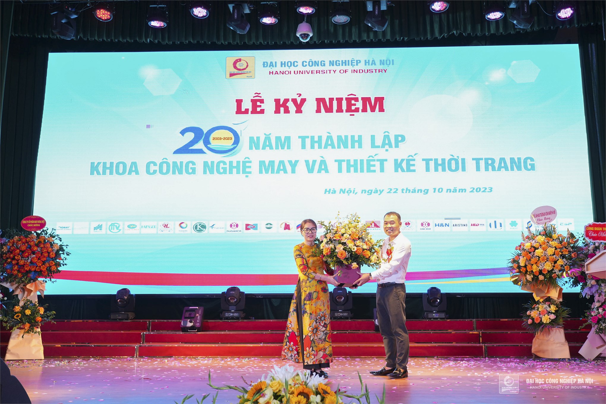 PGS.TS.Lê Hồng Quân thay mặt lãnh đạo Nhà trường tặng hoa chúc mừng 20 năm thành lập Khoa Công nghệ May và Thiết kế thời trang