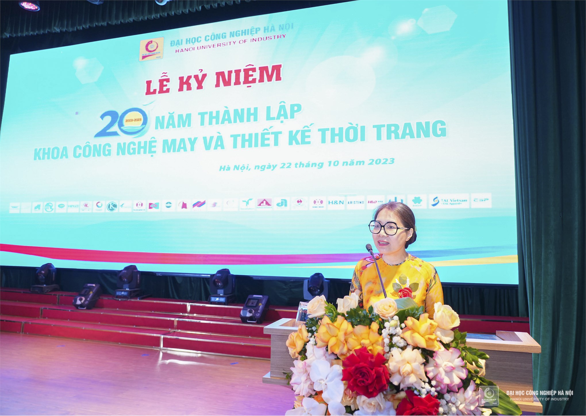 PGS.TS.Nguyễn Thị Lệ - Trưởng khoa Công nghệ May và Thiết kế thời trang nhấn mạnh: 20 năm là mốc son lịch sử tiếp tục ghi nhận những nỗ lực phấn đấu, phát triển và trưởng thành của Khoa, là niềm tự hào của các thế hệ cán bộ, giảng viên và sinh viên của Khoa đang công tác khắp mọi miền đất nước, là sức mạnh to lớn khích lệ các thầy cô và các thế hệ sinh viên của Khoa vượt qua khó khăn thử thách, vững bước đi lên trên con đường nghề nghiệp của mình.