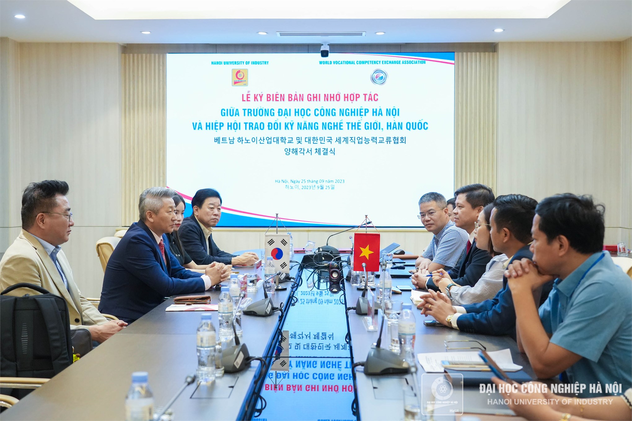 Nhằm mở rộng quan hệ hợp tác, phát triển, sáng ngày 25/9, Đại học Công nghiệp Hà Nội (HaUI) đã có buổi làm việc và ký kết thỏa thuận hợp tác với Hiệp hội trao đổi kỹ năng nghề thế giới, Hàn Quốc (WVCEA)