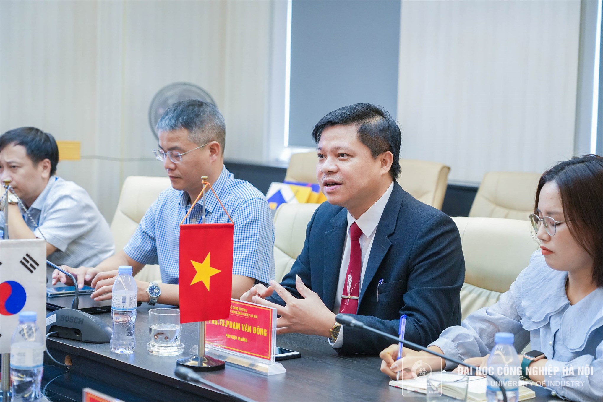 PGS.TS.Phạm Văn Đông - Phó Hiệu trưởng nhà trường vui mừng chào đón Hiệp hội trao đổi kỹ năng nghề thế giới, Hàn Quốc đến làm việc với nhà trường