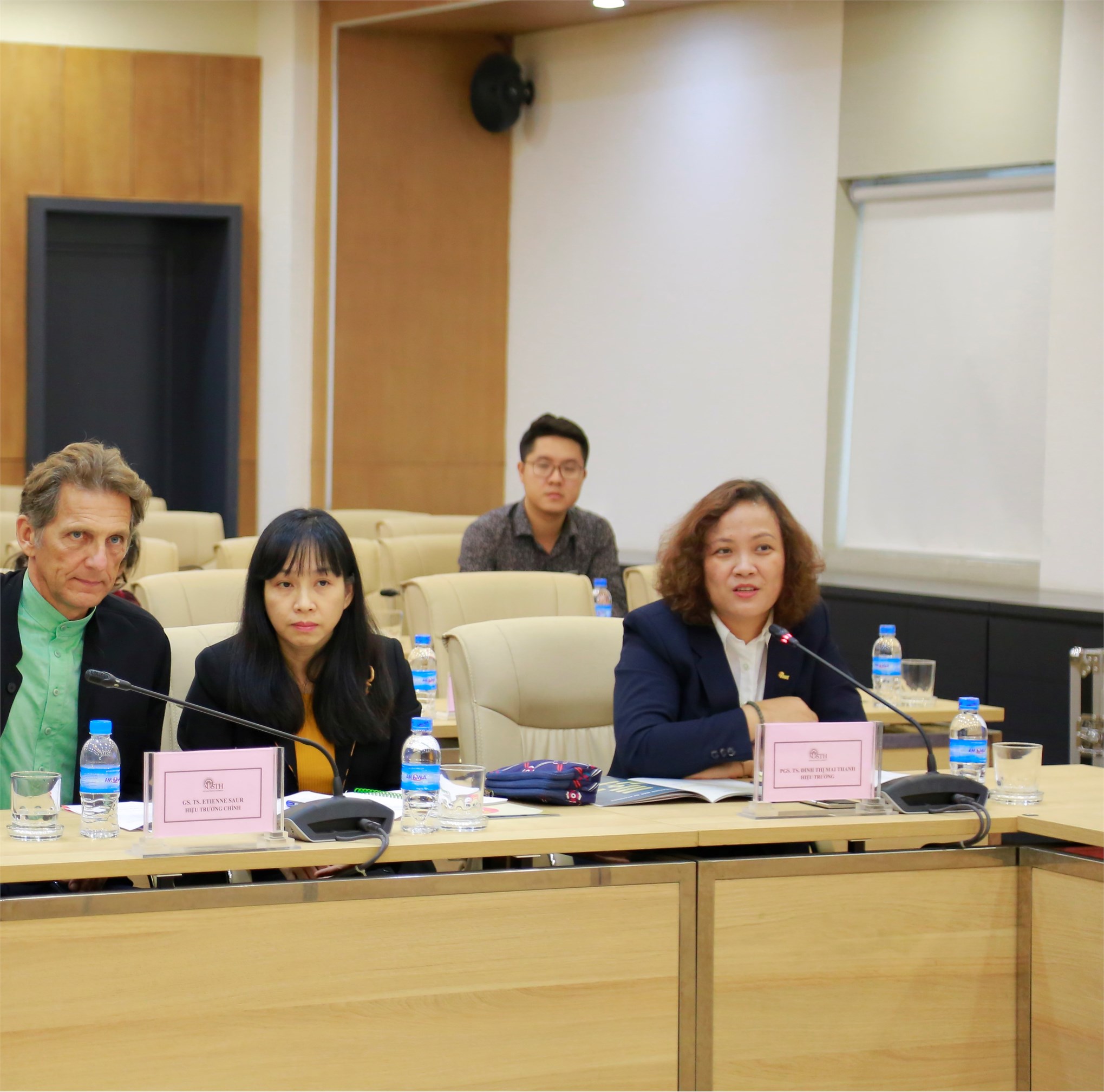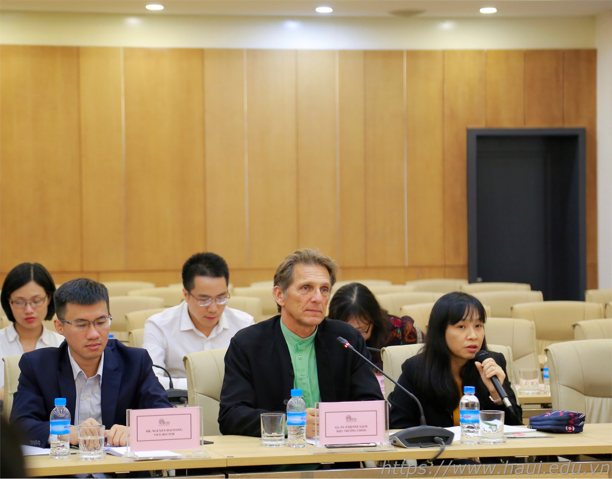 Vui mừng được đến thăm và hợp tác với ĐHCNHN, GS. Etienne Saur – Hiệu trưởng USTH cảm ơn sự đón tiếp trang trọng của Nhà trường dành cho đoàn. Ông Etienne Saur cho biết thực sự ấn tượng với bề dày truyền thống hơn 121 năm của ĐHCNHN, cũng như những thành quả hiện tại mà nhà trường có được, xứng đáng là trường top đầu trong hệ thống các trường đại học hàng đầu Việt Nam. USTH hy vọng trong tương lai sẽ có được nhiều cơ hội hợp tác, trao đổi với ĐHCNHN, tiếp tục hợp tác xây dựng mối quan hệ tốt đẹp để cùng phát triển.