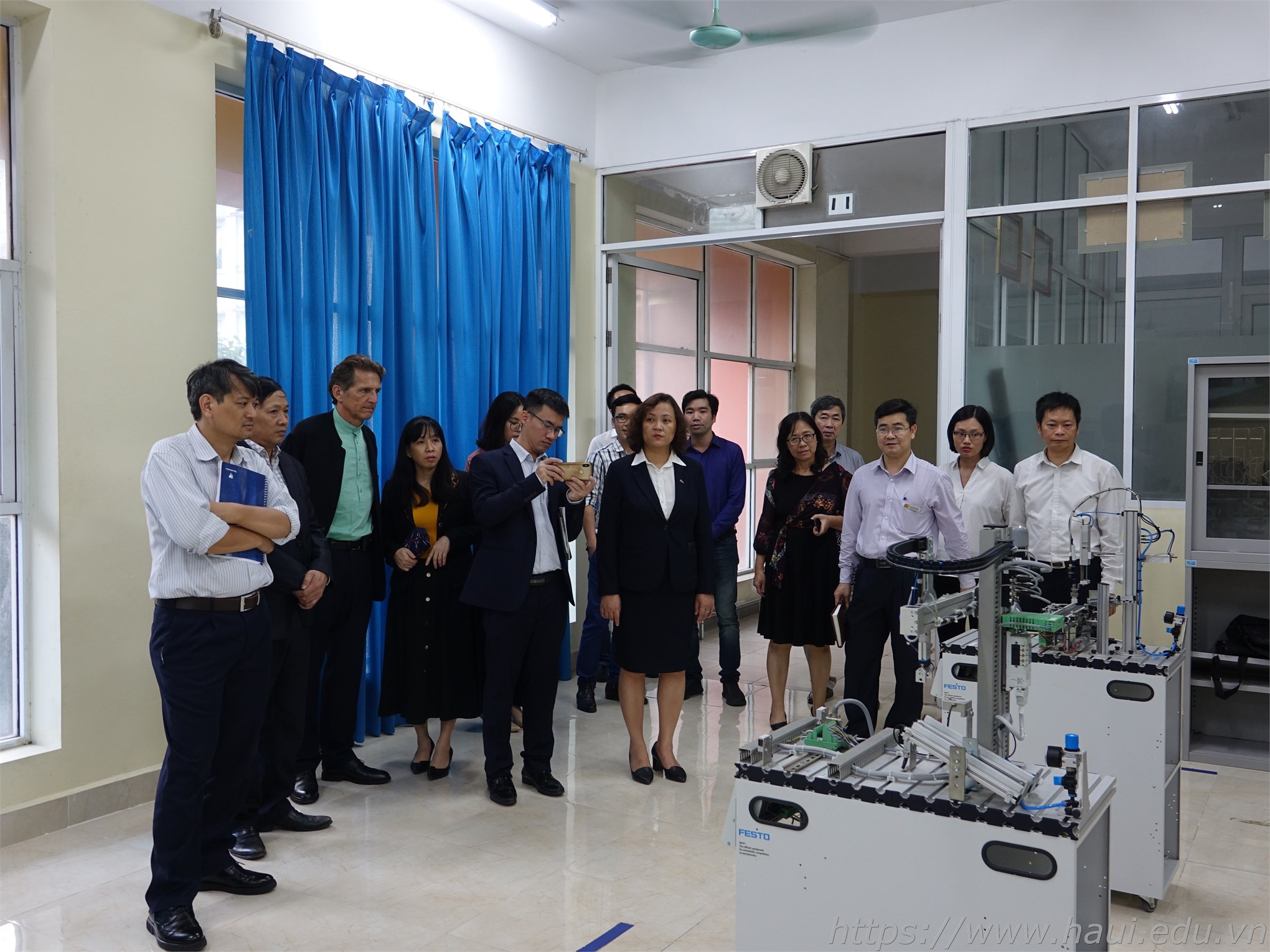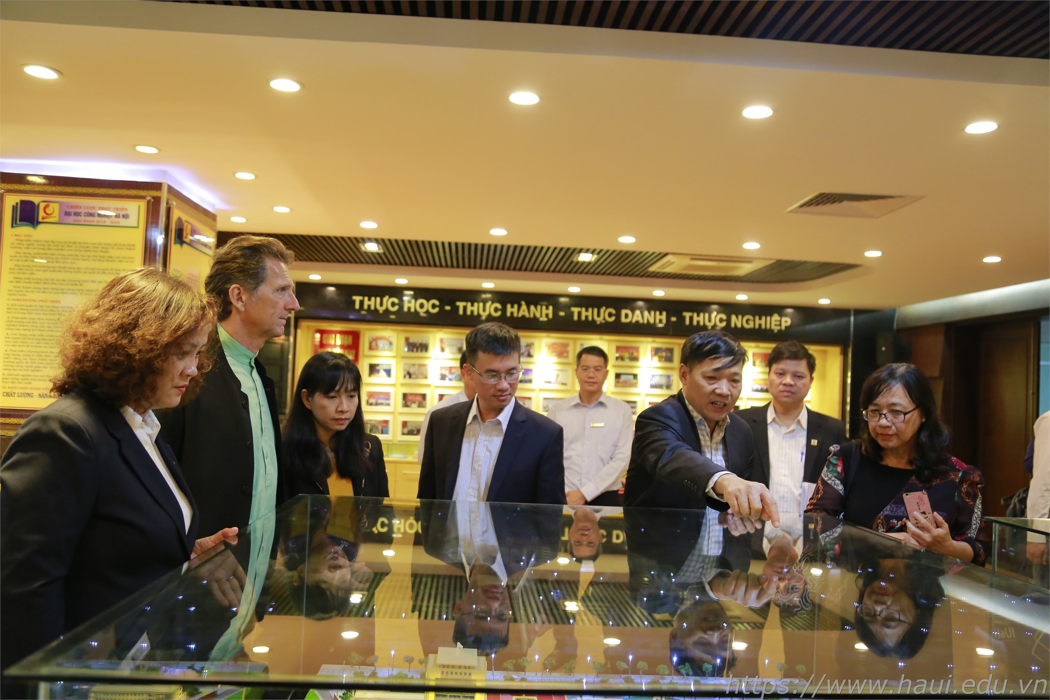 Kết thúc buổi làm việc, USTH đã thăm quan Phòng truyền thống cùng cơ sở vật chất, nhà xưởng thực hành của Đại học Công nghiệp Hà Nội
