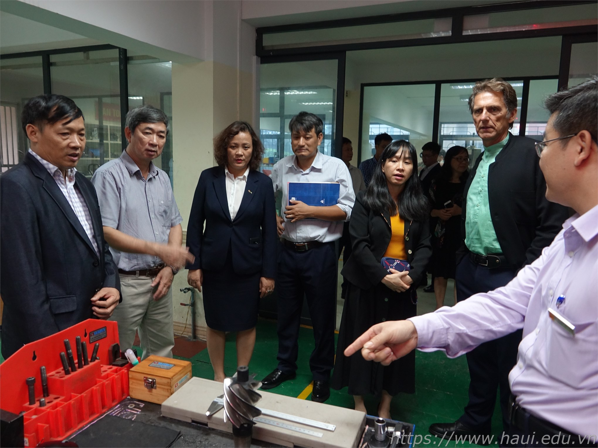 Đón tiếp và làm việc với đoàn, có PGS.TS. Phạm Văn Bổng – Phó Hiệu trưởng nhà trường cùng đại diện trưởng, phó các đơn vị: Phòng Tổ chức Hành chính, Phòng Đào tạo, Phòng Khoa học Công nghệ, Khoa CNTT, Khoa Công nghệ Hóa, Khoa Cơ khí, Khoa Điện, Viện Công nghệ HaUI. Trung tâm Hợp tác quốc tế.
