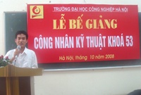 Tại buổi lễ bế giảng, đ/c Vũ Đình Thơm phát biểu chúc mừng 316 học sinh các ngành: Gia công cơ khí, Gia công kim loại tấm và Điều khiển điện hoàn thành khóa học 2 năm và được nhận bằng trong dịp này.
