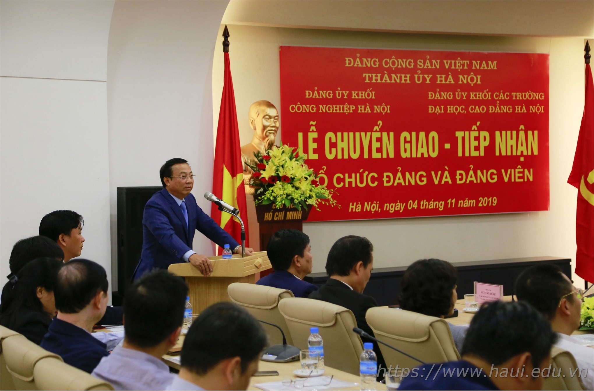 Phát biểu tại buổi lễ, Đồng chí Trịnh Huy Thành - Bí thư Đảng ủy Khối Công nghiệp Hà Nội khẳng định: việc chuyển giao các tổ chức cơ sở Đảng là bước cụ thể hóa trong thực hiện Nghị quyết Trung ương 6 khóa XII về “tiếp tục đổi mới, sắp xếp tổ chức bộ máy của hệ thống chính trị tinh gọn, hoạt động hiệu lực, hiệu quả”. Đảng ủy Khối Công nghiệp Hà Nội tin tưởng rằng 04 trường đại học, cao đẳng sẽ phát huy truyền thống đoàn kết, đóng gíp nhiều hơn trong xây dựng Đảng bộ Khối các trường đại học, cao đẳng Hà Nội ngày càng phát triển vững mạnh.