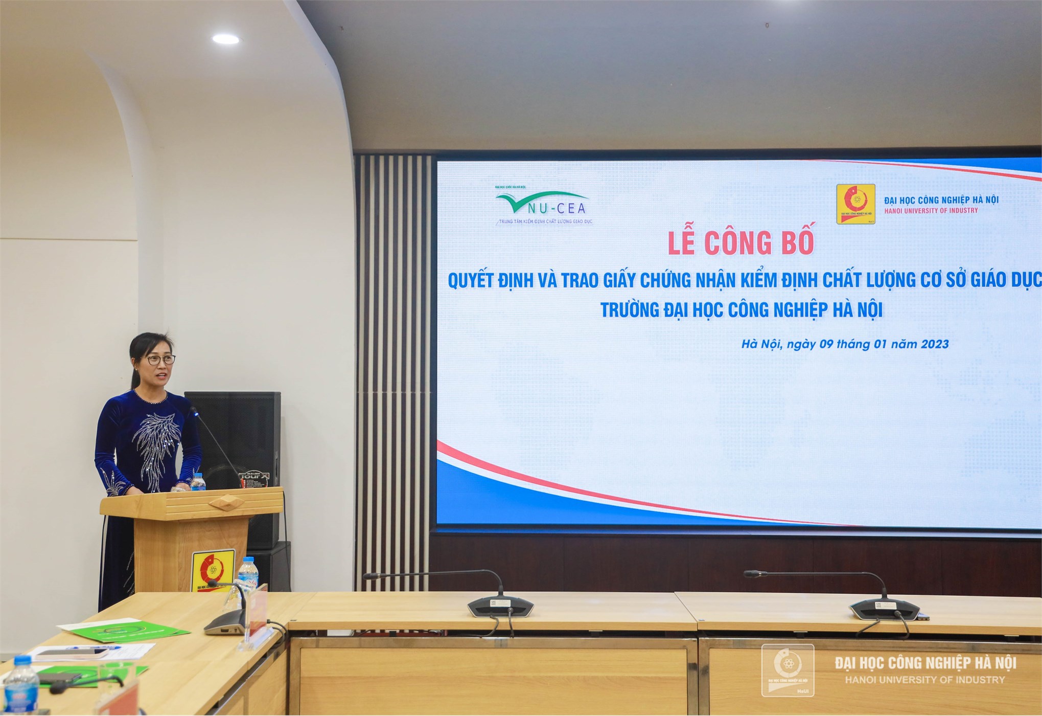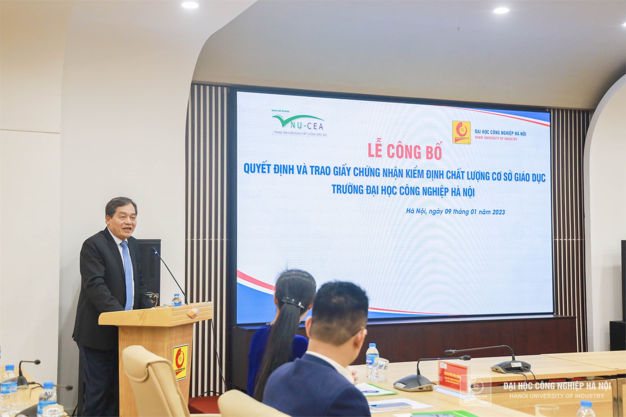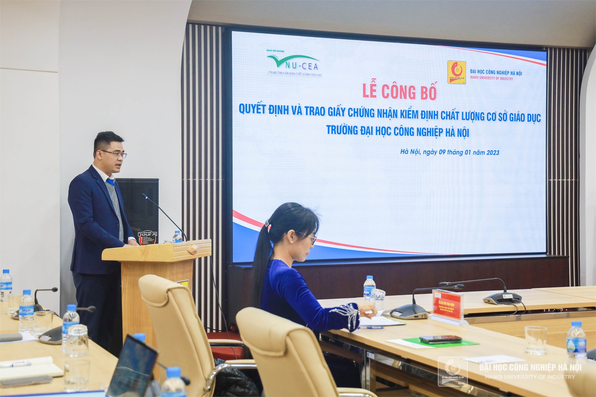 Ông Phạm Vương, Trưởng phòng hành chính tổ chức, Trung tâm Kiểm định chất lượng, Đại học Quốc gia Hà Nội công bố quyết định cấp giấy nhận chứng nhận kiểm định chất lượng cơ sở giáo dục của Trường Đại học Công nghiệp Hà Nội
