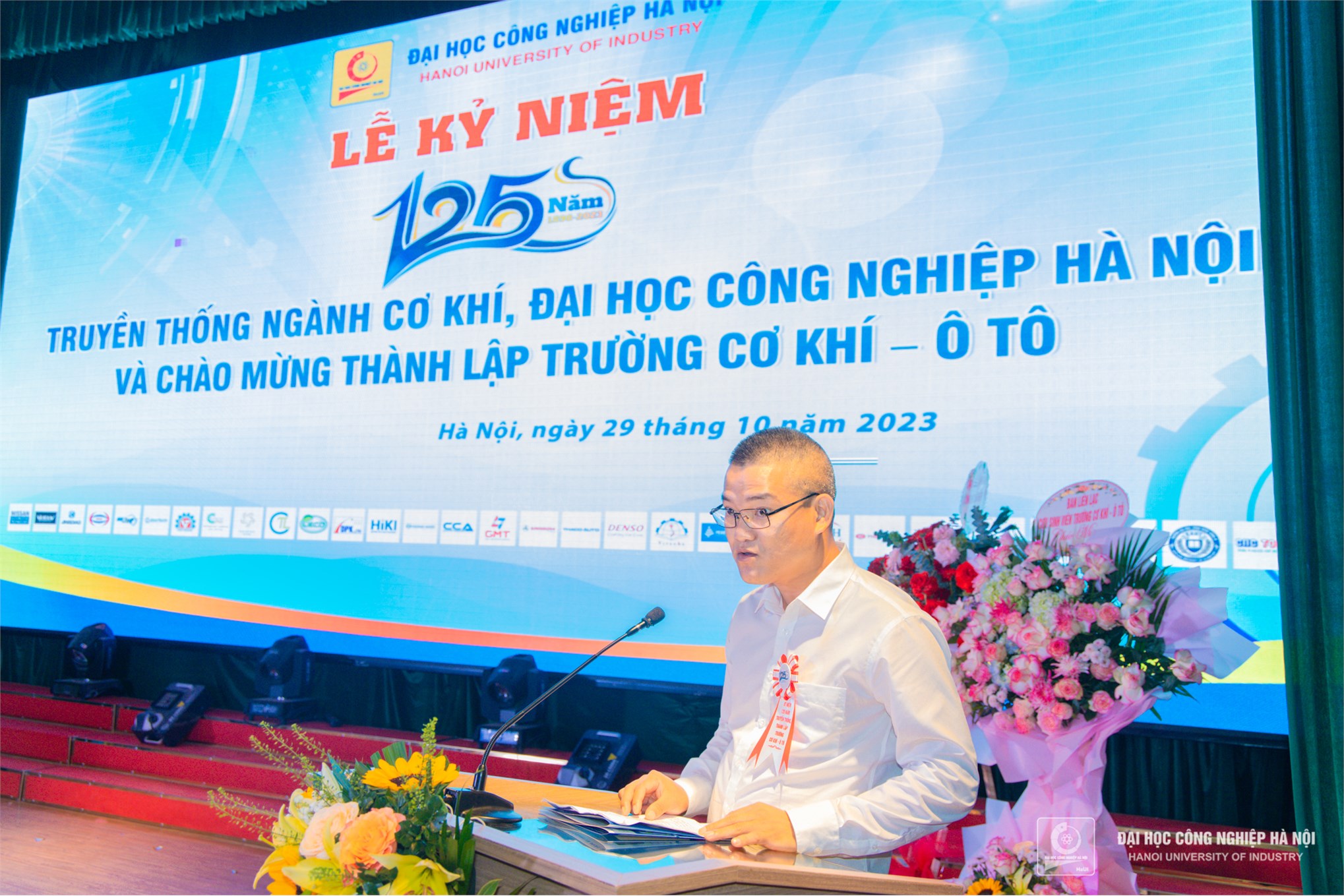 PGS.TS.Hoàng Tiến Dũng – Hiệu trưởng Trường Cơ khí – Ô tô, Đại học Công nghiệp Hà Nội chào mừng và chân thành cảm ơn các đại biểu, khách quý, các thế hệ cán bộ, giảng viên, sinh viên đã đến dự và chia sẻ niềm vui cùng đại gia đình Cơ khí, HaUI