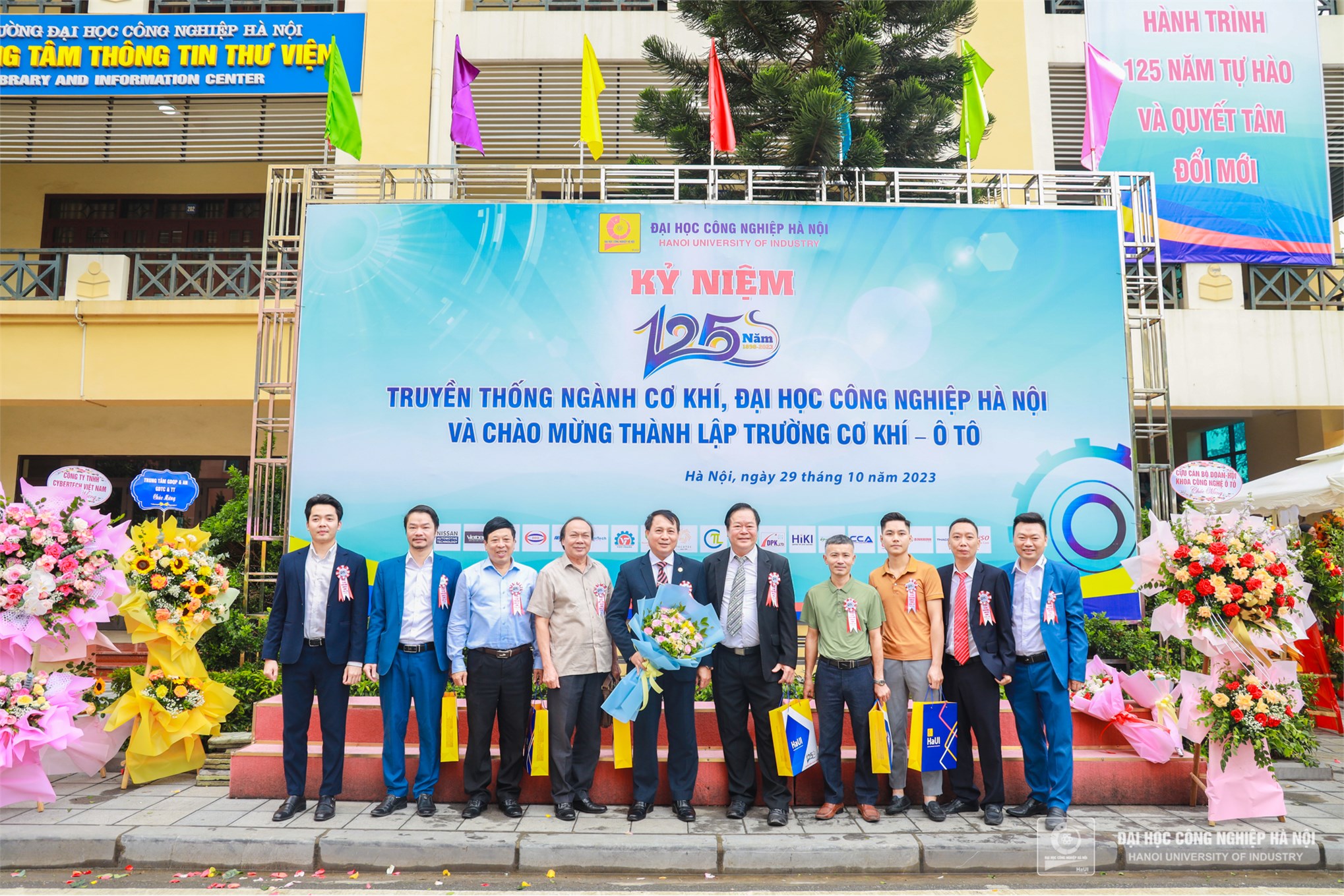 PGS.TS.Hoàng Tiến Dũng – Hiệu trưởng Trường Cơ khí – Ô tô (HaUI), TS.Nguyễn Xuân Chung - Giám đốc Trung tâm Việt Nhật; PGS.TS.Nguyễn Tiến Hán - Giám đốc Trung tâm Công nghệ Ô tô và Đào tạo lái xe tặng hoa các doanh nghiệp và nhà tài trợ