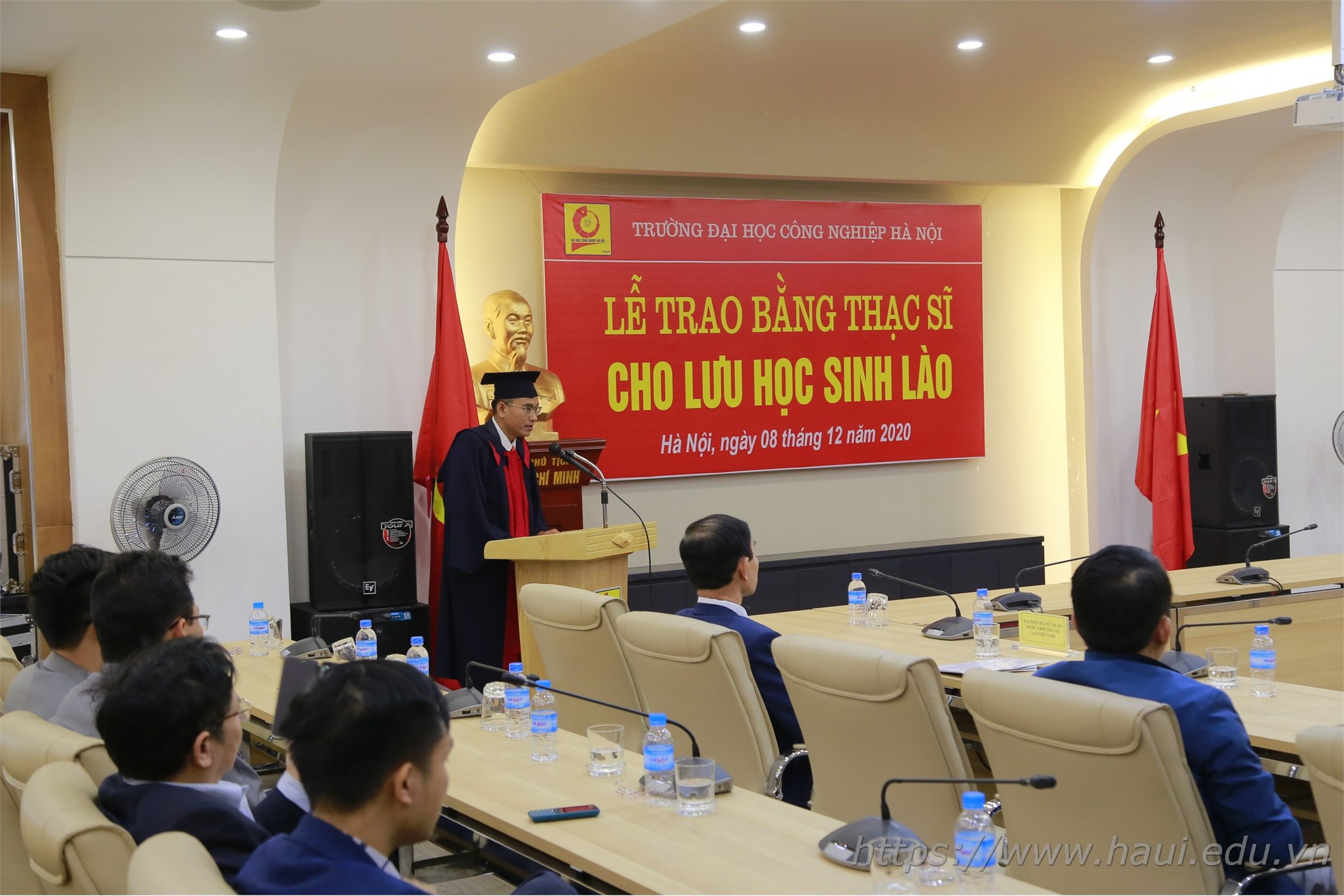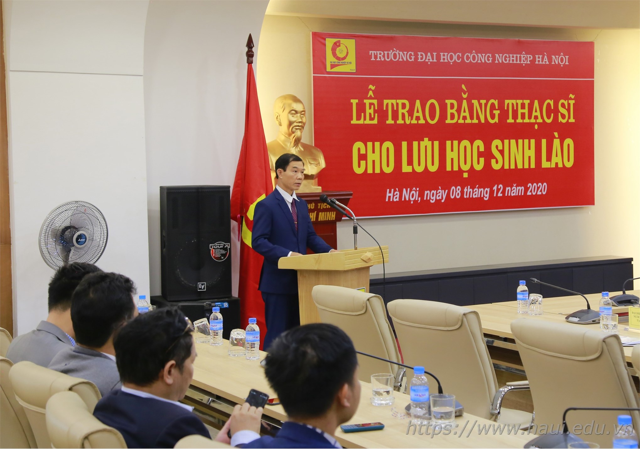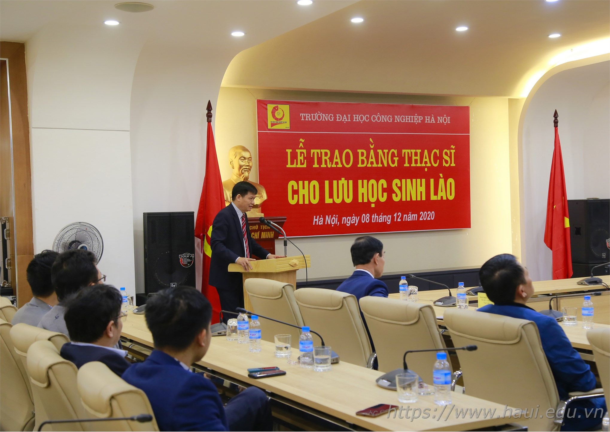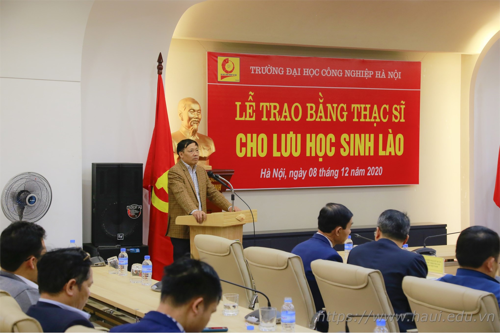 Phát biểu tại buổi Lễ, PGS.TS. Phạm Văn Bổng - Phó Hiệu trưởng nhà trường chúc mừng, biểu dương và ghi nhận sự cố gắng, nỗ lực của các học viên đã khắc phục mọi khó khăn, hoàn thành tốt chương trình đào tạo và được nhận bằng thạc sĩ ngày hôm nay. Thầy tin tưởng rằng bằng nghị lực, ý chí và những kiến thức mới, được trang bị có hệ thống ở trình độ thạc sĩ, các tân Thạc sĩ sẽ tiếp tục nắm bắt cơ hội, vượt qua thử thách để vươn tới những thành công mới, đóng góp xây dựng quê hương, đất nước, góp phần xây dựng mối quan hệ Việt - Lào ngày càng bền chặt, phát triển.