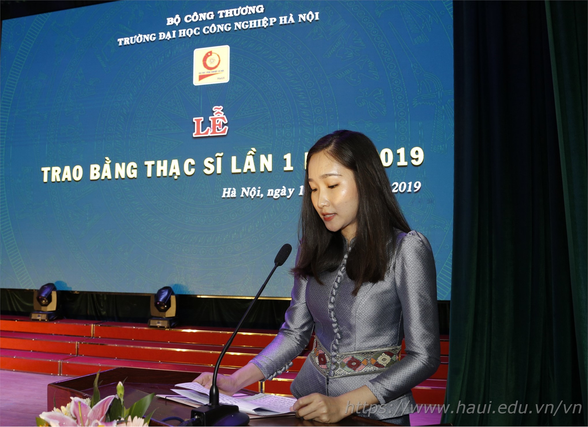 Đại diện cho 124 tân Thạc sĩ, học viên Chanthalasy Sompathana đến từ nước Cộng hòa Dân chủ nhân dân Lào nhận bằng thạc sĩ Quản trị kinh doanh đã phát biểu, bày tỏ niềm vui, niềm tự hào khi được học tập và nghiên cứu tại trường ĐHCNHN; bày tỏ lòng biết ơn tới Lãnh đạo Nhà trường, các thầy cô giáo, các cán bộ quản lý đã quan tâm, tạo điều kiện tốt nhất cho các học viên, đặc biệt là các học viên người nước ngoài. Chanthalasy Sompathana xúc động và hứa sẽ nỗ lực hơn nữa, đóng góp tài năng, trí tuệ cho sự phát triển của đất nước Lào, Việt Nam trong thời kinh tế hội nhập.