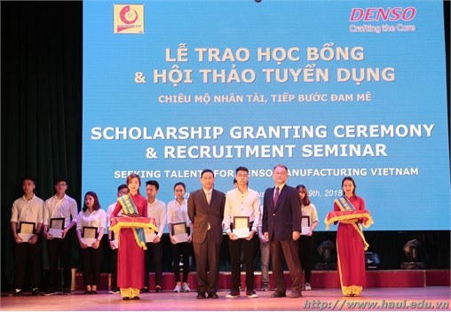 Đại diện DENSO trao tặng 20 suất học bổng cho sinh viên có thành tích học tập cao, nhằm động viên, khích lệ tinh thần vươn lên học tập cho sinh viên.