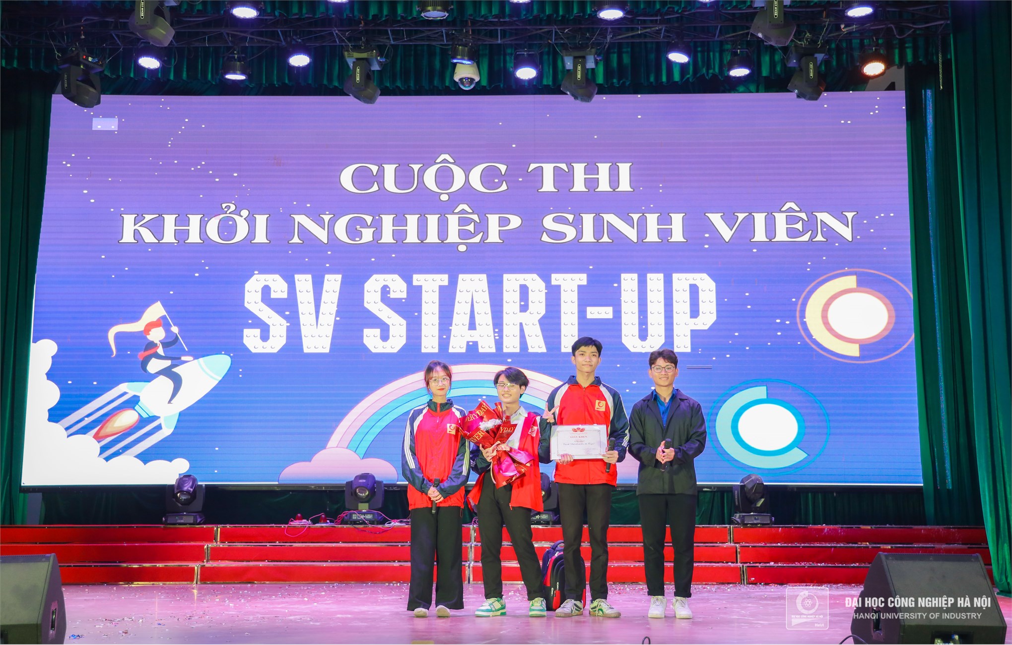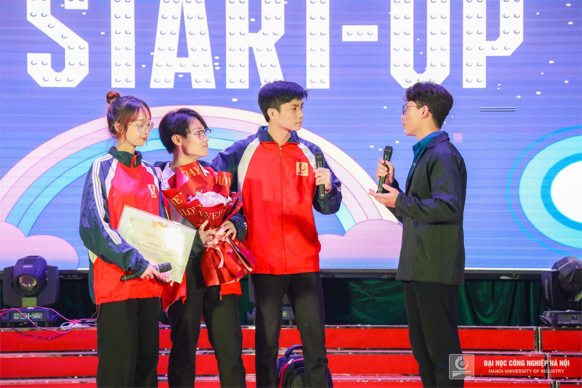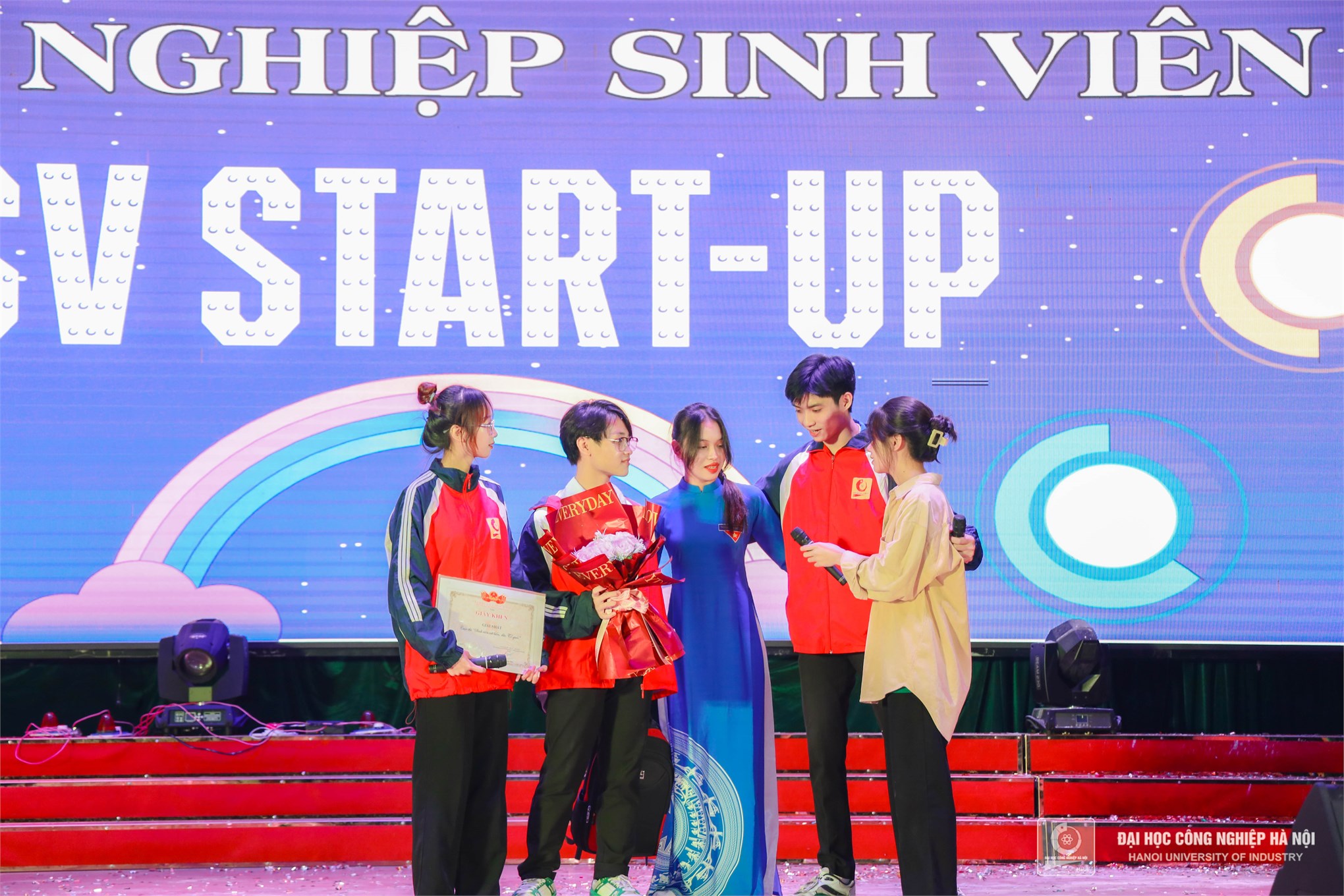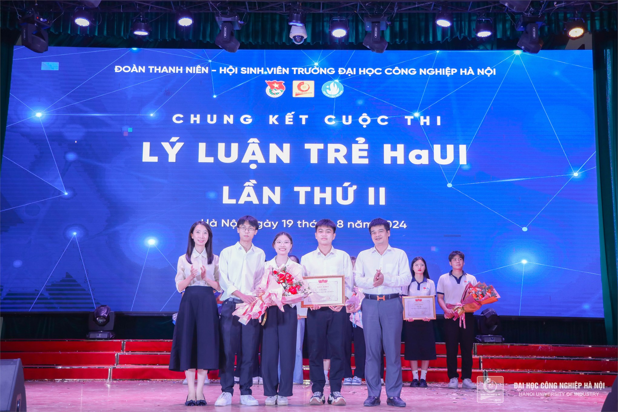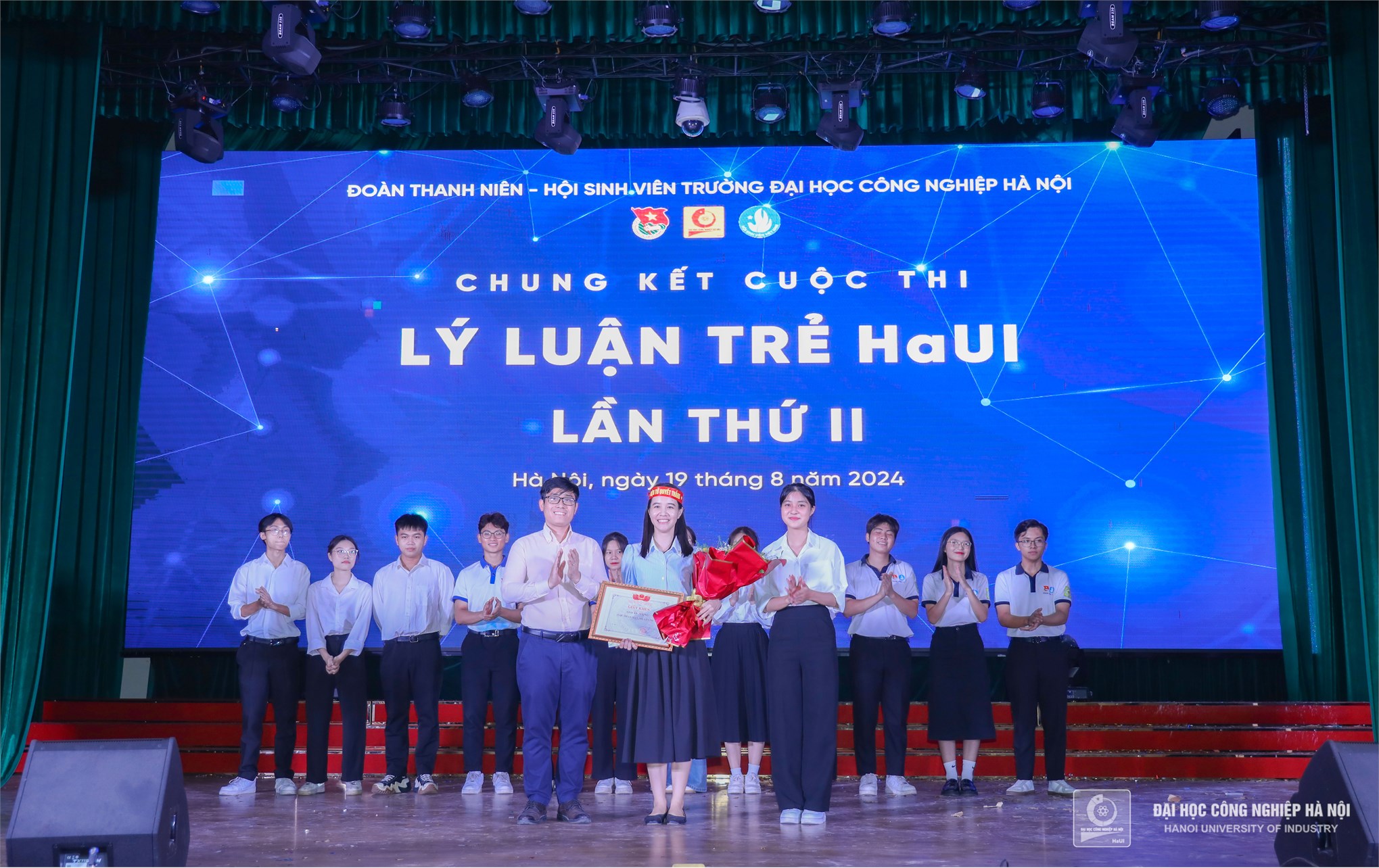 Đồng chí Nguyễn Tiến Tấn – Phó Bí thư Đoàn thanh niên Trường Đại học Công nghiệp Hà Nội và đồng chí Trần Thị Hương Giang - Chủ tịch Hội sinh viên Trường Đại học Công nghiệp Hà Nội trao giải thưởng Ấn tượng nhất giành cho Liên chi đoàn Khoa Điện tử có đội cổ vũ đông đảo, nhiệt tình, ấn tượng nhất