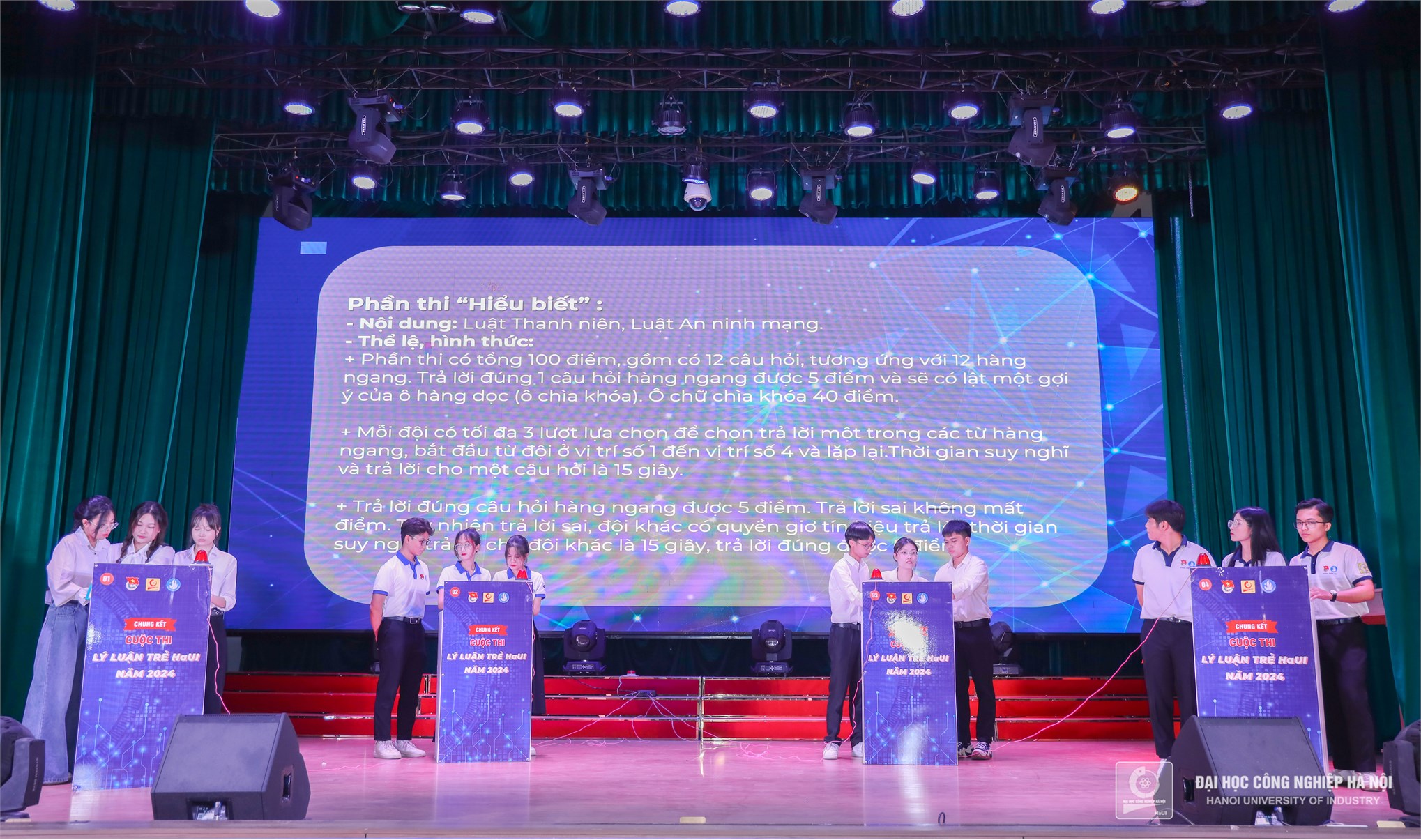 4 đội thi đã có màn “đọ sức” gay cấn tại phần thi hiểu biết và phần thi vững kiến thức, giỏi lý luận. Với kiến thức đa chiều và sâu sắc, các bạn sinh viên đã cùng nhau hùng biện phần thi của mình, từ đó, sinh viên được được rèn luyện bản lĩnh sân khấu, tự tin, khả năng tranh luận sắc bén, sự phối hợp đồng đội nhịp nhàng để bảo vệ quan điểm của mình.