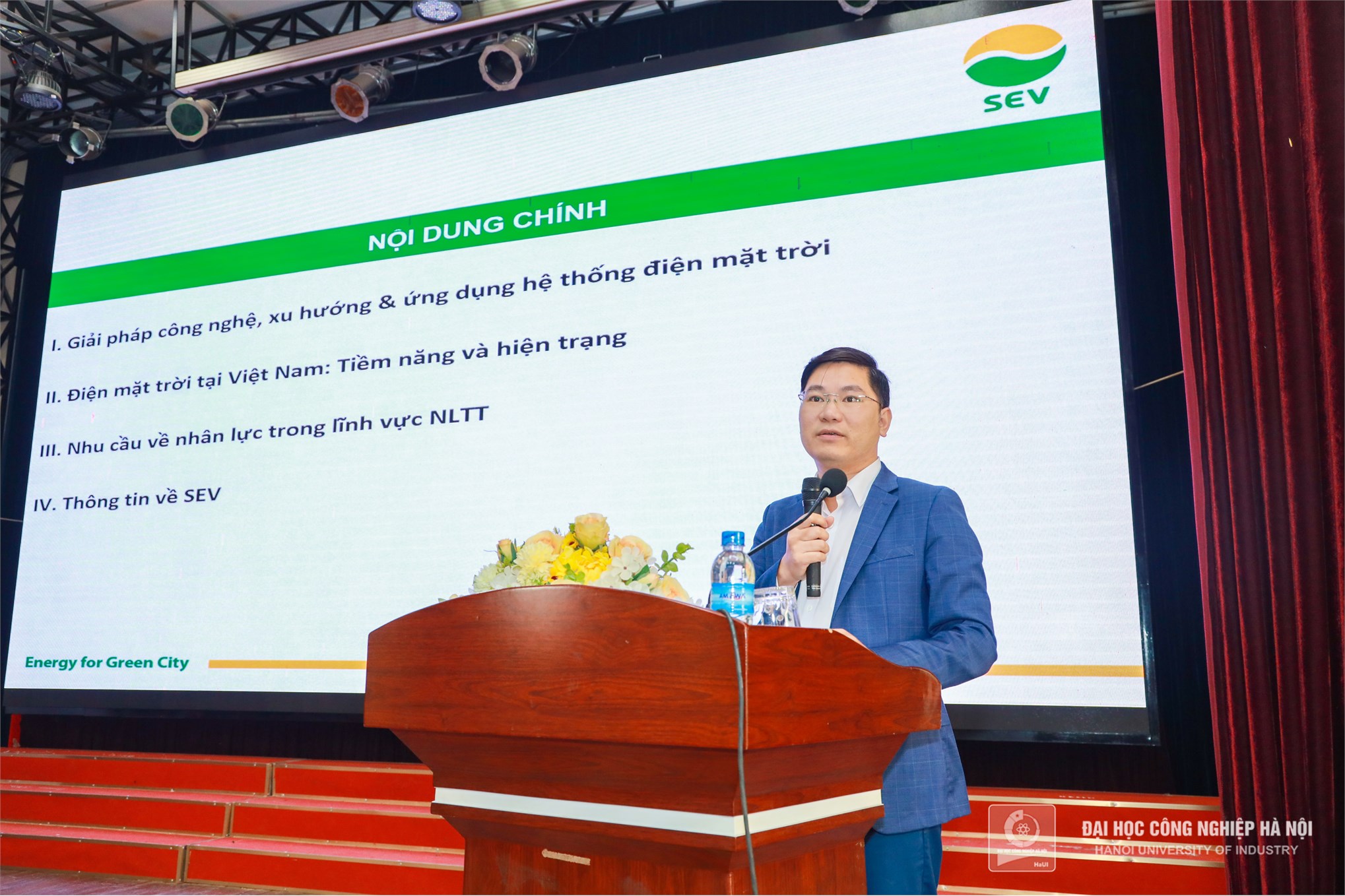 Mr. Lưu Minh Tiến, Tổng Giám đốc Công ty Cổ phần Solar Electric Việt Nam trình bày báo cáo “Công nghệ điện mặt trời & nhu cầu nhân lực trong hành trình tạo năng lượng xanh” tại Diễn đàn