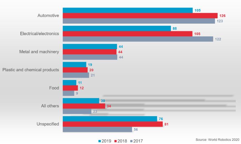 Doanh số bán robot công nghiệp mới vẫn ở mức cao với 373.000 chiếc được xuất xưởng trên toàn cầu vào năm 2019 (với tổng giá trị 13.8 tỉ đô la). Bên cạnh đó, trong giai đoạn 5 năm từ 2014 đến 2019, robot công nghiệp được lắp đặt mới hàng năm trên thế giới liên tục tăng trưởng đạt tỉ lệ bình quân 11% năm. Trong đó lĩnh vực xe hơi chiếm tỉ lệ ứng dụng cao nhất với 28% trong tổng số robot được lắp đặt mới, lĩnh vực điện/điện tử chiếm 24%, ngành thép và thiết bị cơ khí chiếm 12%, lĩnh vực hóa chất 5%, lĩnh vực thực phẩm và đồ uống chiếm 3%, còn lại 20% robot ứng dụng trong các lĩnh vực khác (Hình 1).
