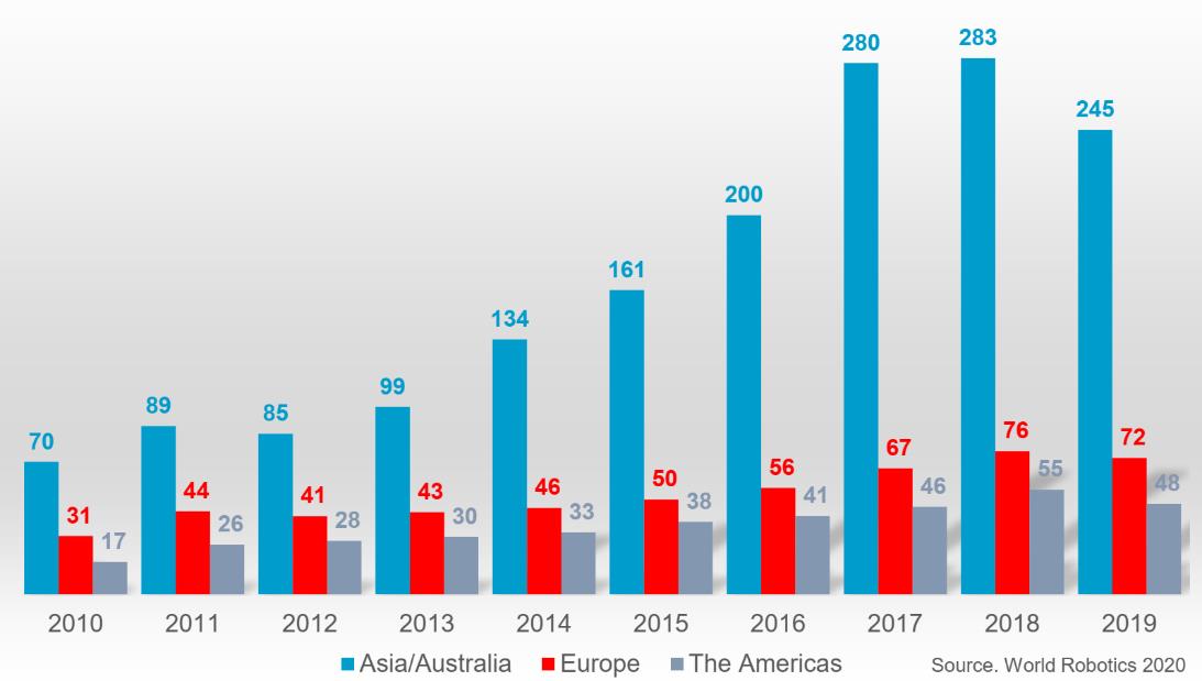 Các nghiên cứu cho thấy Châu Á là khu vực chiếm tỉ trọng lớn nhất, tiếp theo là Châu Âu và Châu Mỹ, trong đó 73% robot công nghiệp được lắp đặt mới hàng năm đến từ năm thị trường chính là Trung Quốc, Nhật bản, Mỹ, Hàn Quốc và Đức. Trong đó Trung Quốc vẫn là thị trường lớn nhất với khoảng 140 nghìn robot được lắp đặt mới trong năm 2019 và thấp nhất trong nhóm trên là Đức với khoảng 20,5 nghìn robot được lắp đặt mới trong năm (Hình 2). Số lượng robot bình quân trên 100000 người lao động là 113 robot vào năm 2019.