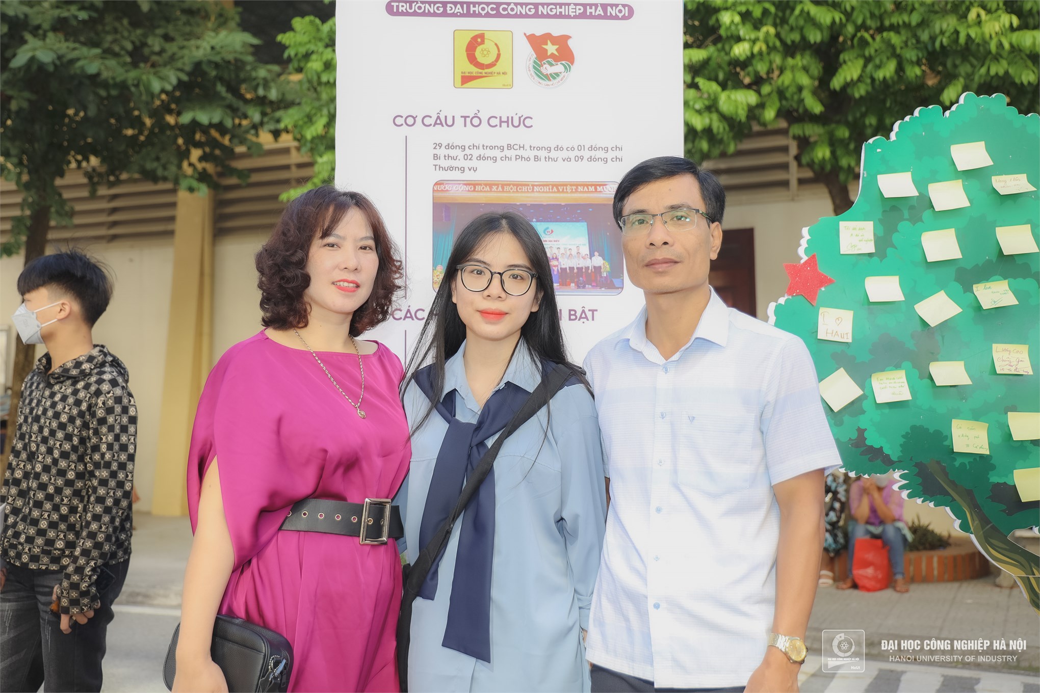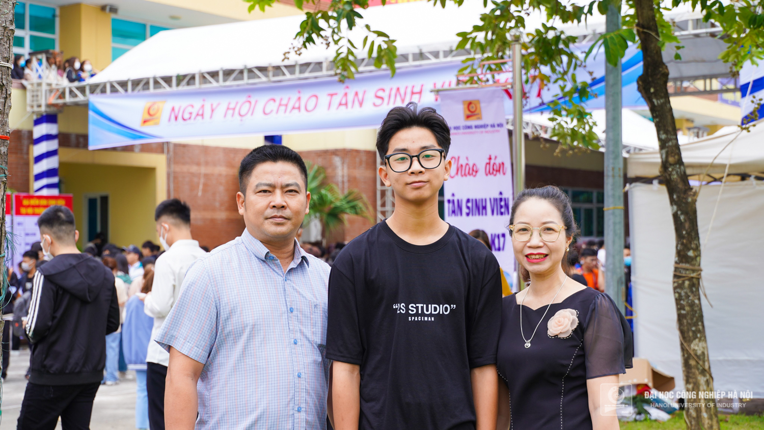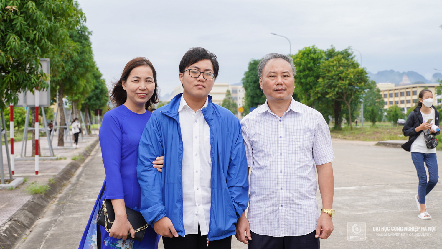 Chị Nguyễn Thị Vân (Hòa Bình) đưa cậu con trai là Vương Thành Long đến nhập học tại khoa Công nghệ thông tin. Chị chia sẻ: Gia đình đến đây từ rất sớm, và thực sự an tâm khi gửi gắm con tại Đại học Công nghiệp Hà Nội. Chúc thầy và trò nhà trường sẽ có một năm học thắng lợi