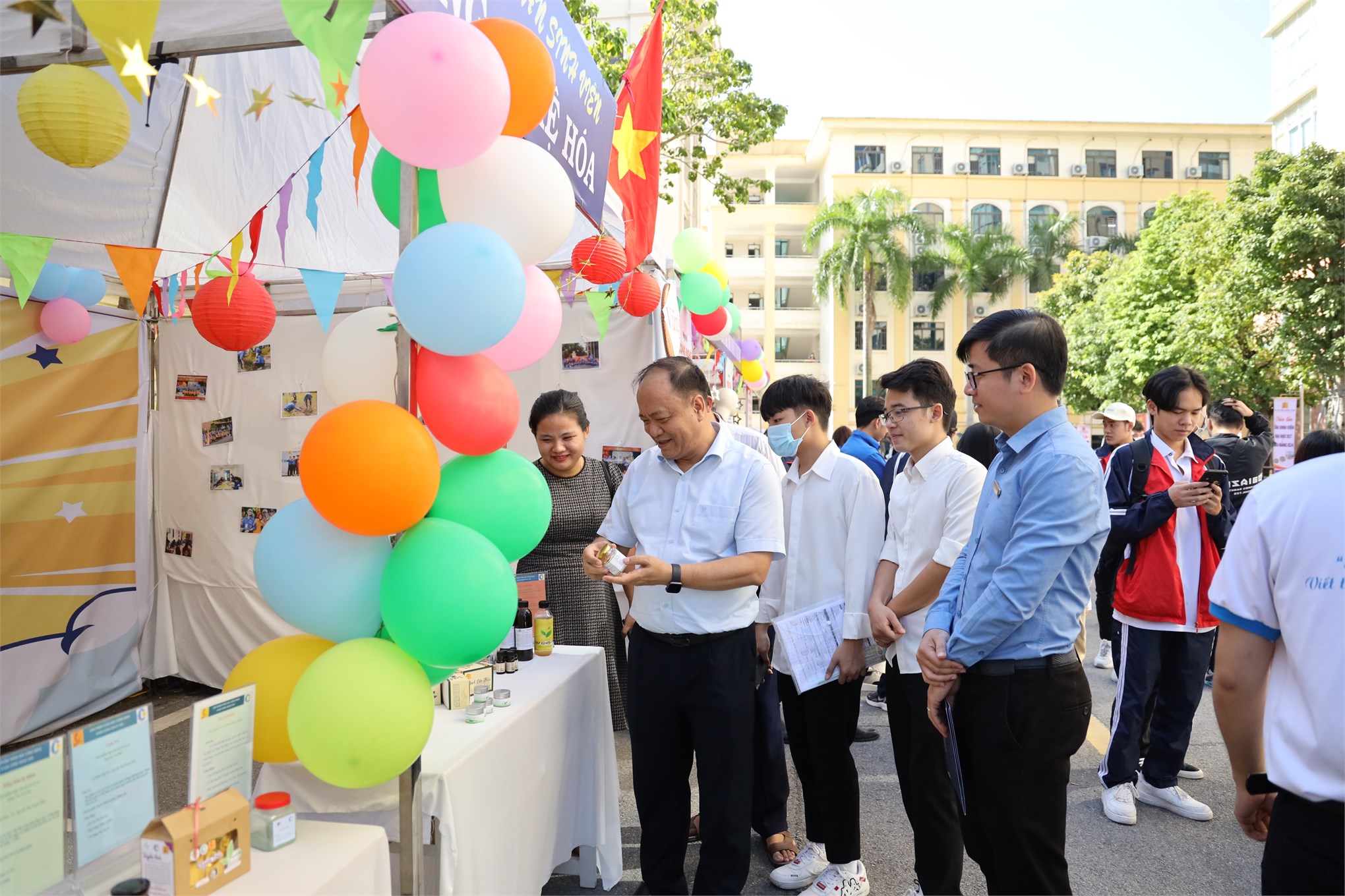 TS.Nguyễn Văn Thiện – Phó Hiệu trưởng Nhà trường chụp ảnh cùng sinh viên tại gian hàng của Khoa Công nghệ thông tin