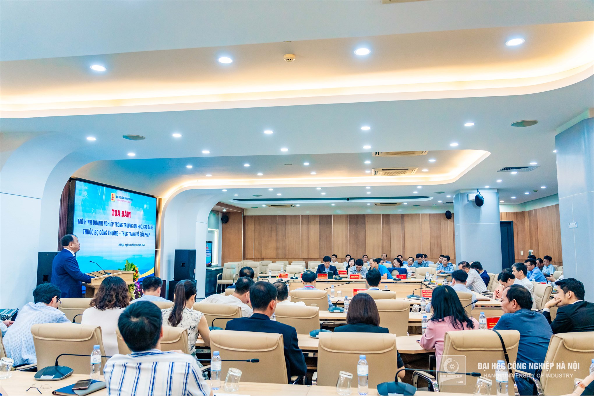 Chào đón sự có mặt của ông Phạm Ngọc Lan - UV thường vụ, Trưởng Ban Công tác Hiệp hội các trường Đại học, Cao đẳng Việt Nam và hơn 70 đại biểu, đại diện cho hơn 30 cơ sở giáo dục của Bộ Công Thương, TS.Nguyễn Văn Thiện – Phó Hiệu trưởng Trường Đại học Công nghiệp Hà Nội, Chủ tịch Hội đồng thành viên Công ty TNHH Đào tạo và Cung ứng nhân lực HaUI (Công ty LETCO trực thuộc trường) nhấn mạnh: Tọa đàm hôm nay là diễn đàn chia sẻ các bài học kinh nghiệm phát triển mô hình doanh nghiệp trong trường, đánh giá những cơ hội và thách thức, nhằm đưa ra những giải pháp, giúp định hướng phát triển hoạt động của các doanh nghiệp trong trường một cách hiệu quả phù hợp với mục tiêu, chiến lược thời kỳ mới. Mô hình trong trường có Trường, Viện nghiên cứu, Doanh nghiệp đã được Đại học Công nghiệp Hà Nội triển khai hiệu quả, góp phần nâng cao chất lượng đào tạo và khẳng định thương hiệu của Đại học Công nghiệp Hà Nội trong những năm qua.