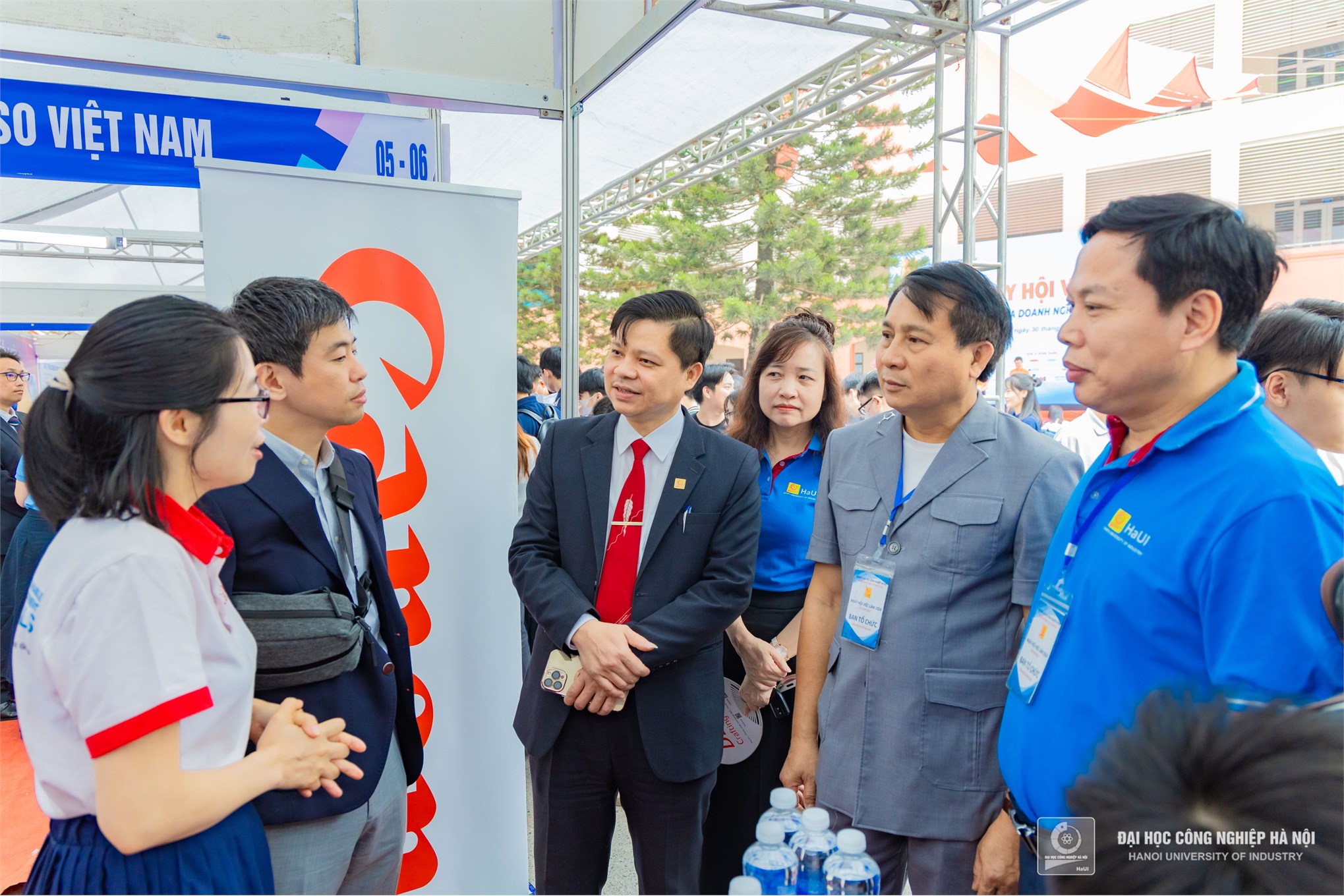 PGS.TS.Lê Hồng Quân – Bí thư Đảng ủy, Chủ tịch Hội đồng Trường và PGS.TS.Phạm Văn Đông – Phó Hiệu trưởng Đại học Công nghiệp Hà Nội tham quan các gian hàng