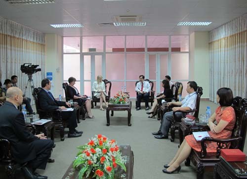 Tiếp và làm việc với Đoàn có TS. Trần Đức Quý - Hiệu trưởng, Phó Hiệu trưởng Bùi Thị Ngân, lãnh đạo: phòng Hợp tác quốc tế, khoa Đào tạo hợp tác quốc tế.