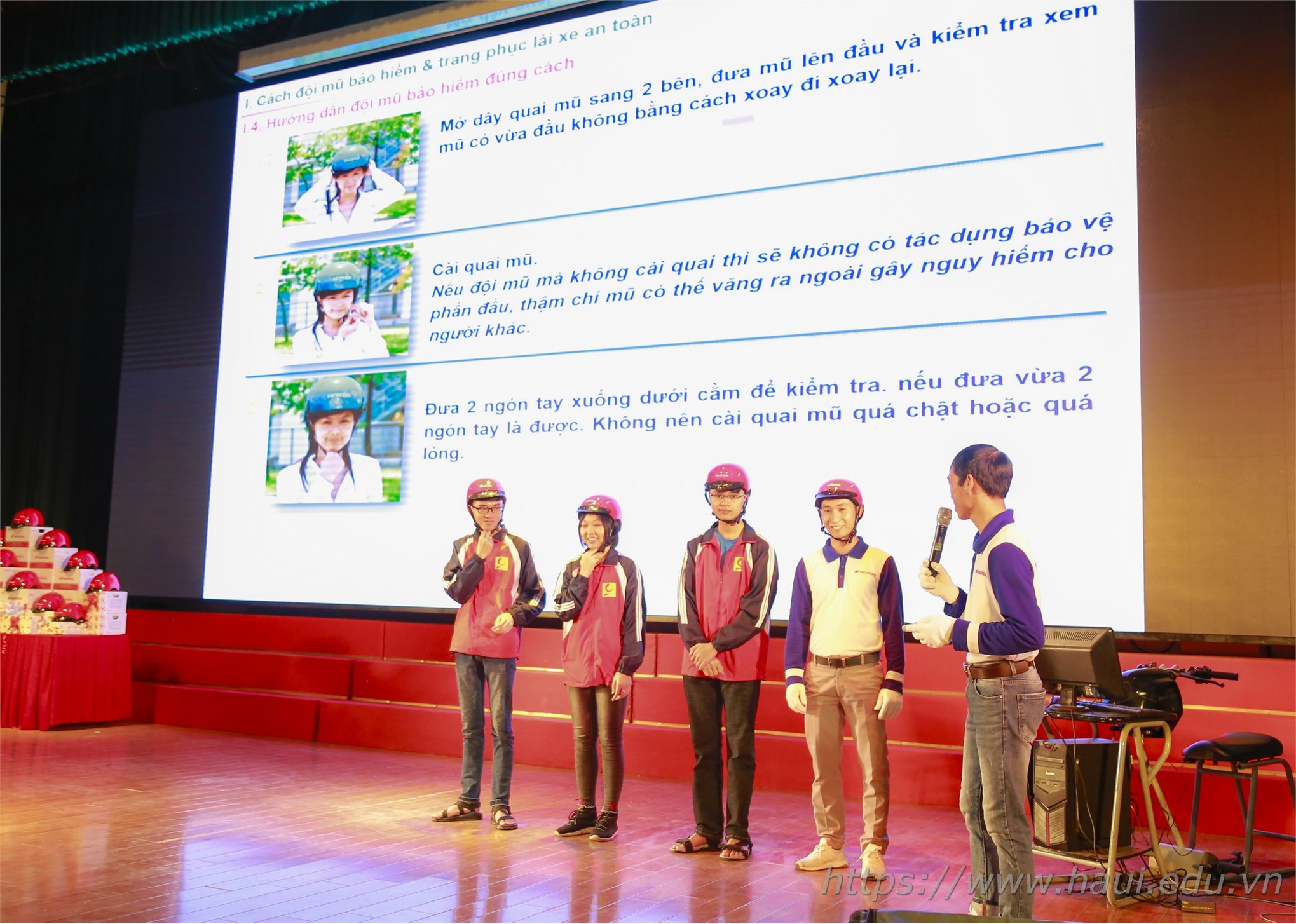 Các bạn trực tiếp được hướng dẫn cách đội mũ bảo hiểm đúng cách