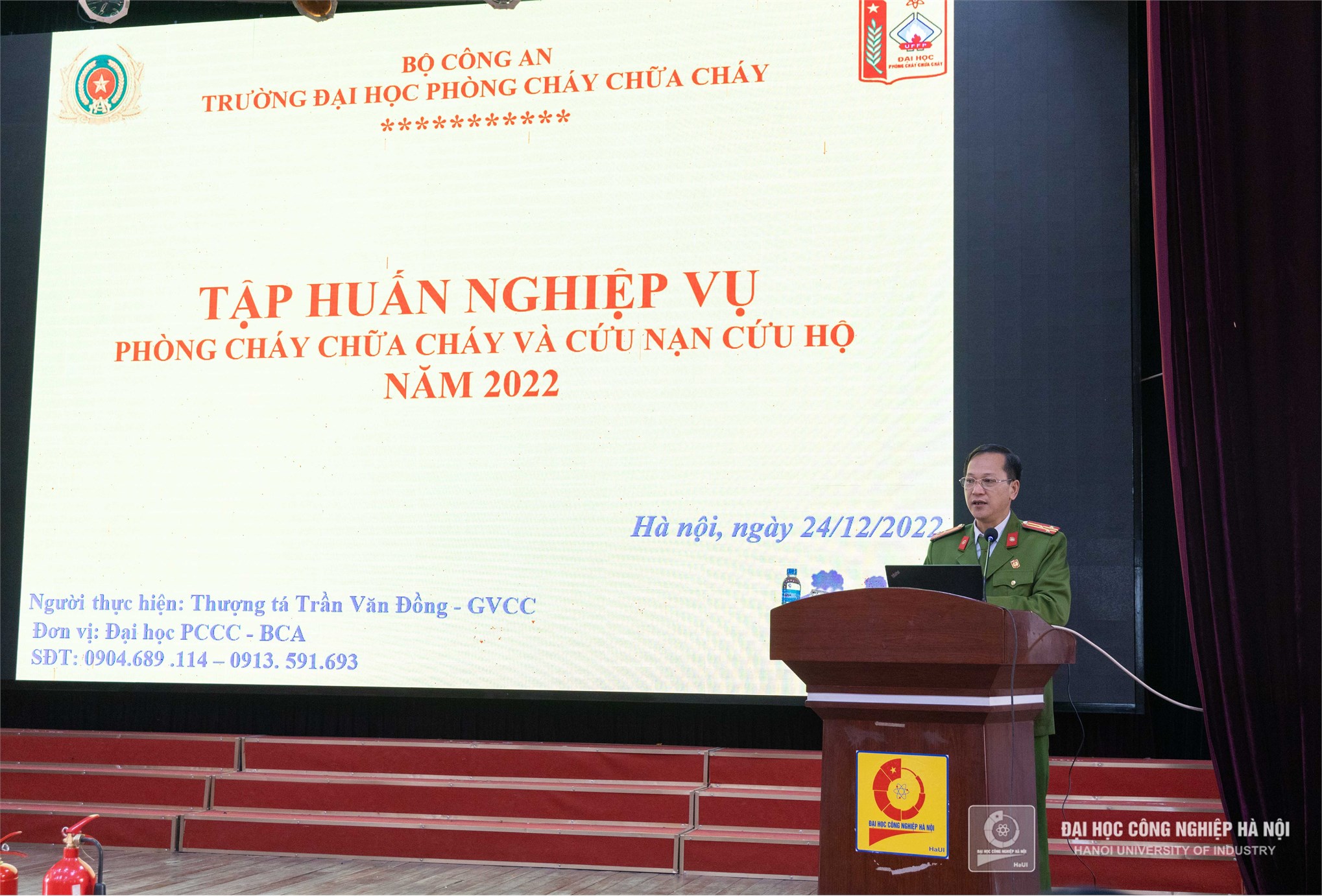 Sáng ngày 24/12/2022, Công an Phòng cháy chữa cháy và cứu hộ, cứu nạn (PCCC&CHCN) quận Bắc Từ Liêm phối hợp với Trường Đại học Công nghiệp Hà Nội (ĐHCNHN) tổ chức tập huấn nghiệp vụ và thực tập phương án PCCC&CHCN cho các đội viên Đội PCCC tại cơ sở 1 và cơ sở 2 của Trường ĐHCNHN. TS.Nguyễn Văn Thiện – Phó Hiệu trưởng, Trưởng ban PCCC và CHCN nhà trường chủ trì buổi tập huấn.