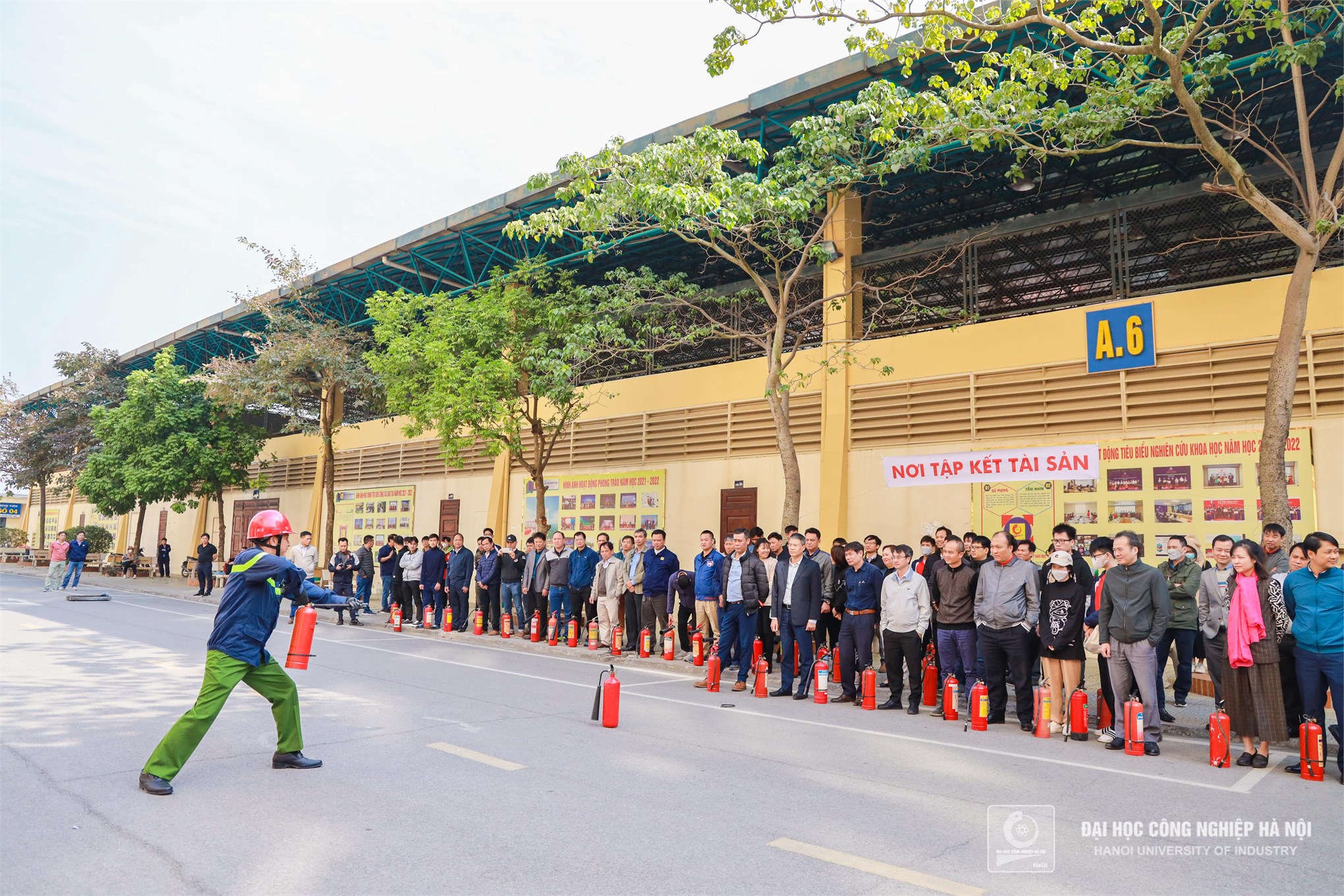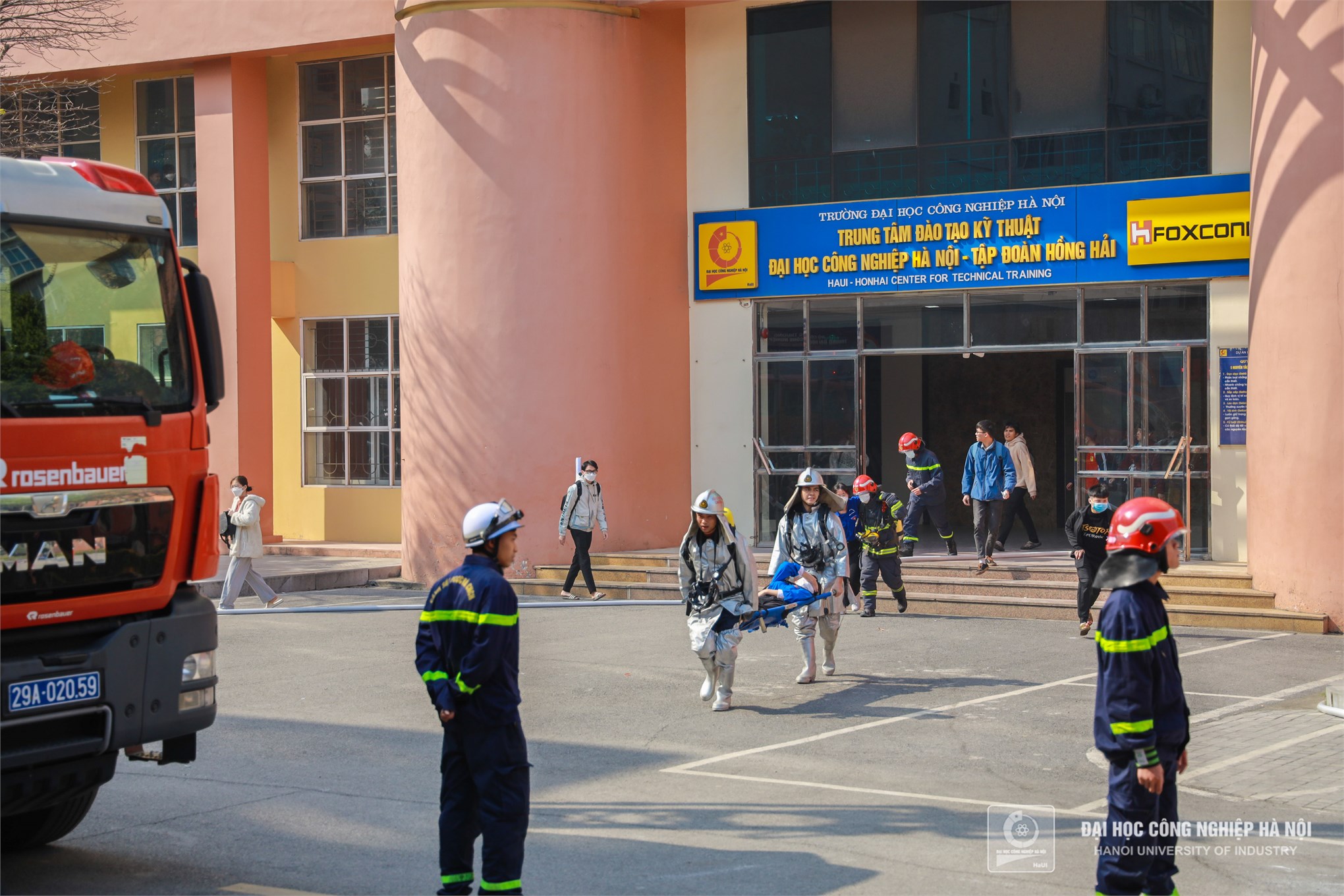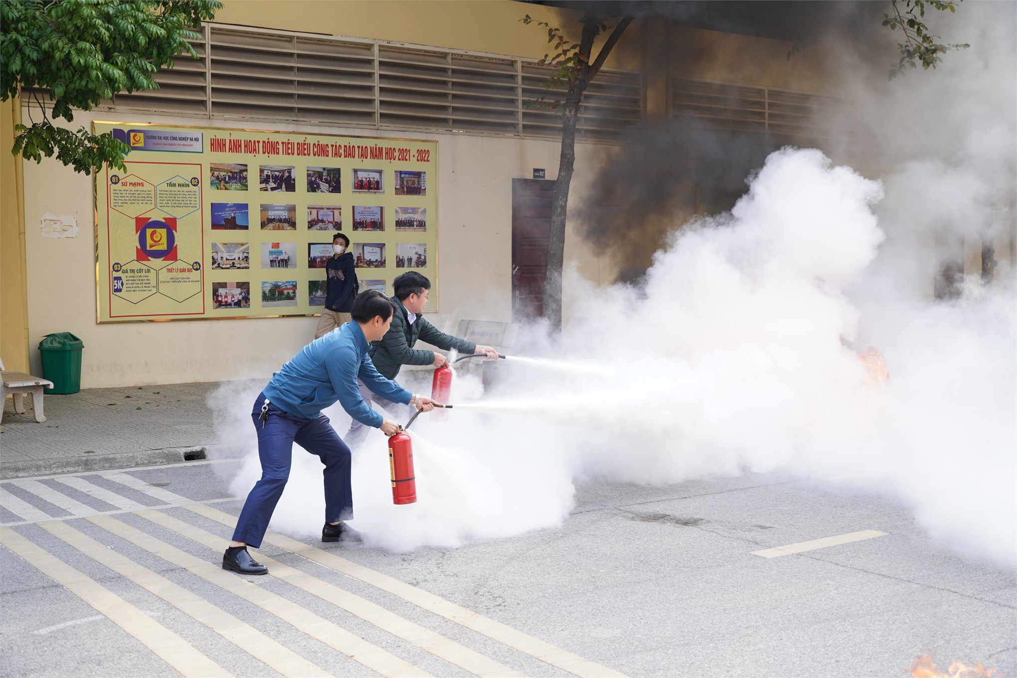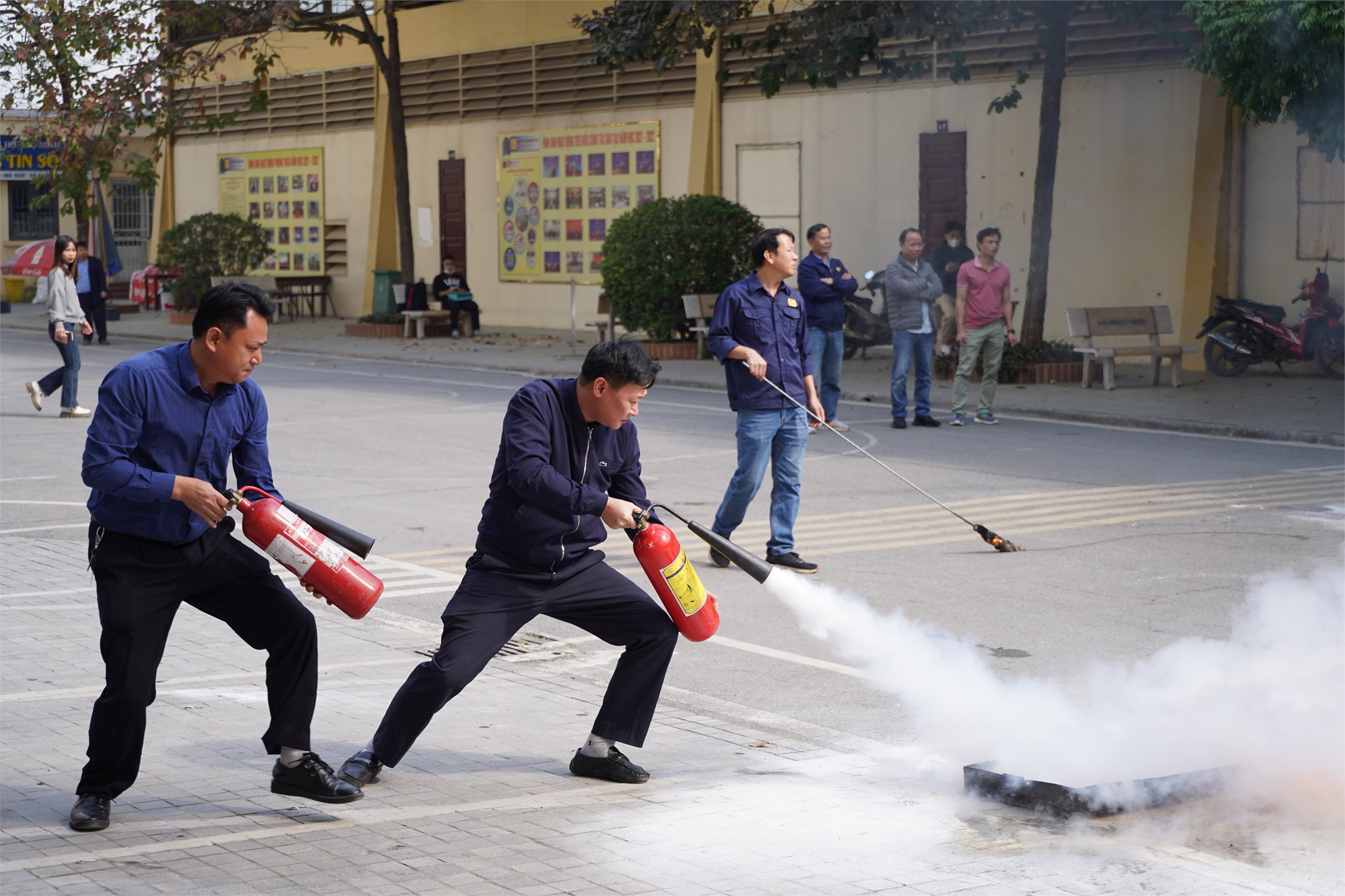 Phần quan trọng của buổi tập huấn đó là diễn tập thực tiễn công tác phòng cháy chữa cháy. Cán bộ, giảng viên, sinh viên được tham gia diễn tập, sử dụng bình khí, bình bọt, diễn tập tình huống giả định thực tiễn có sự tham gia của lực lượng Phòng cháy chữa cháy công an Quận Bắc Từ Liêm.