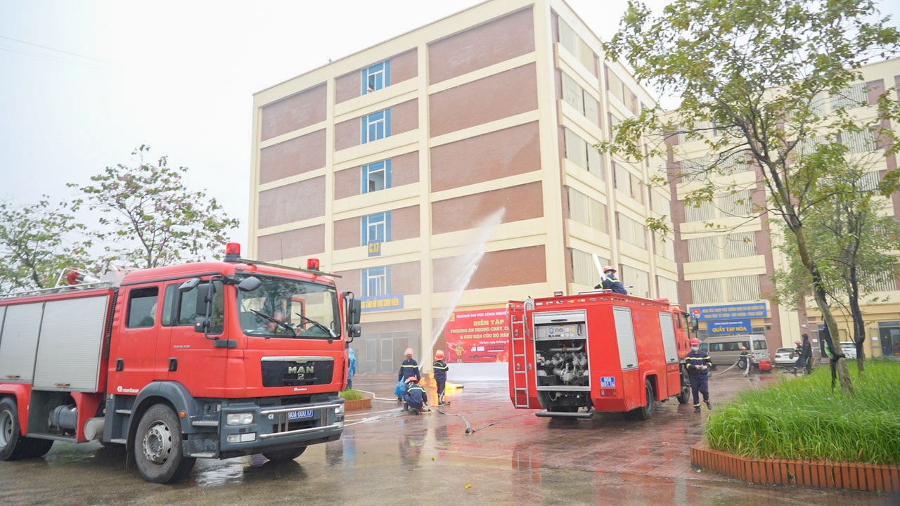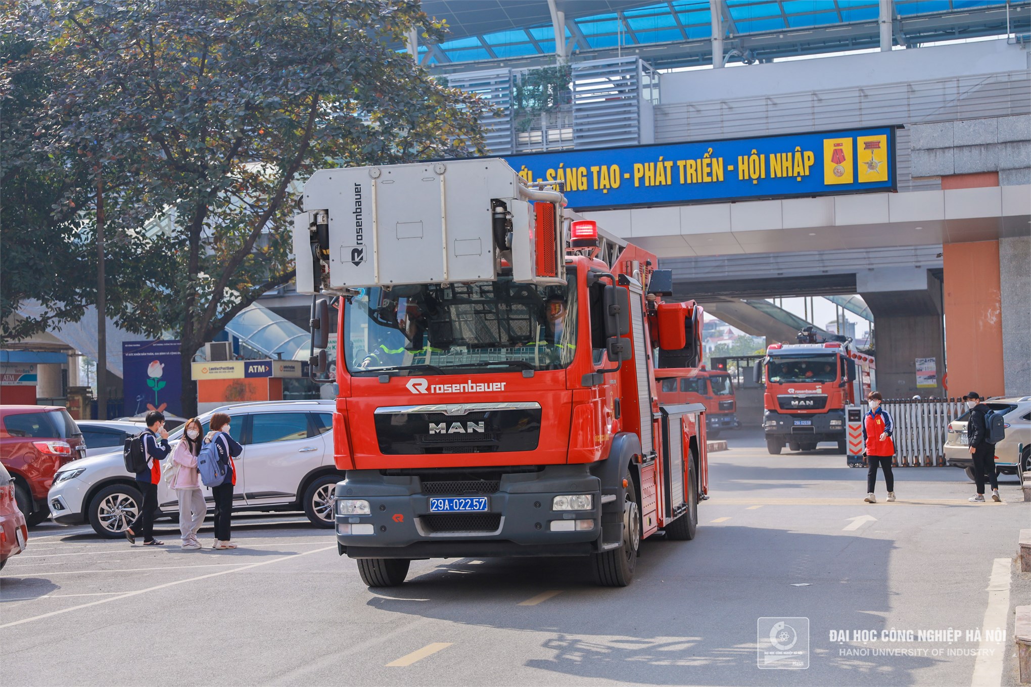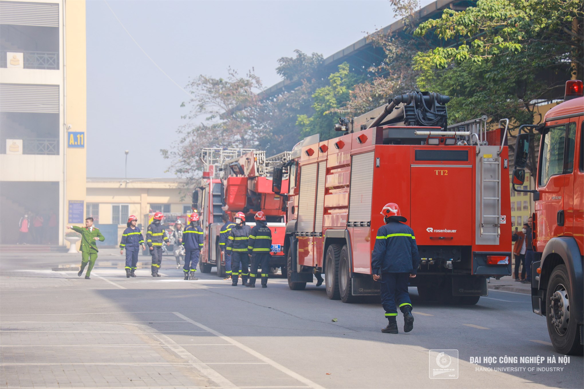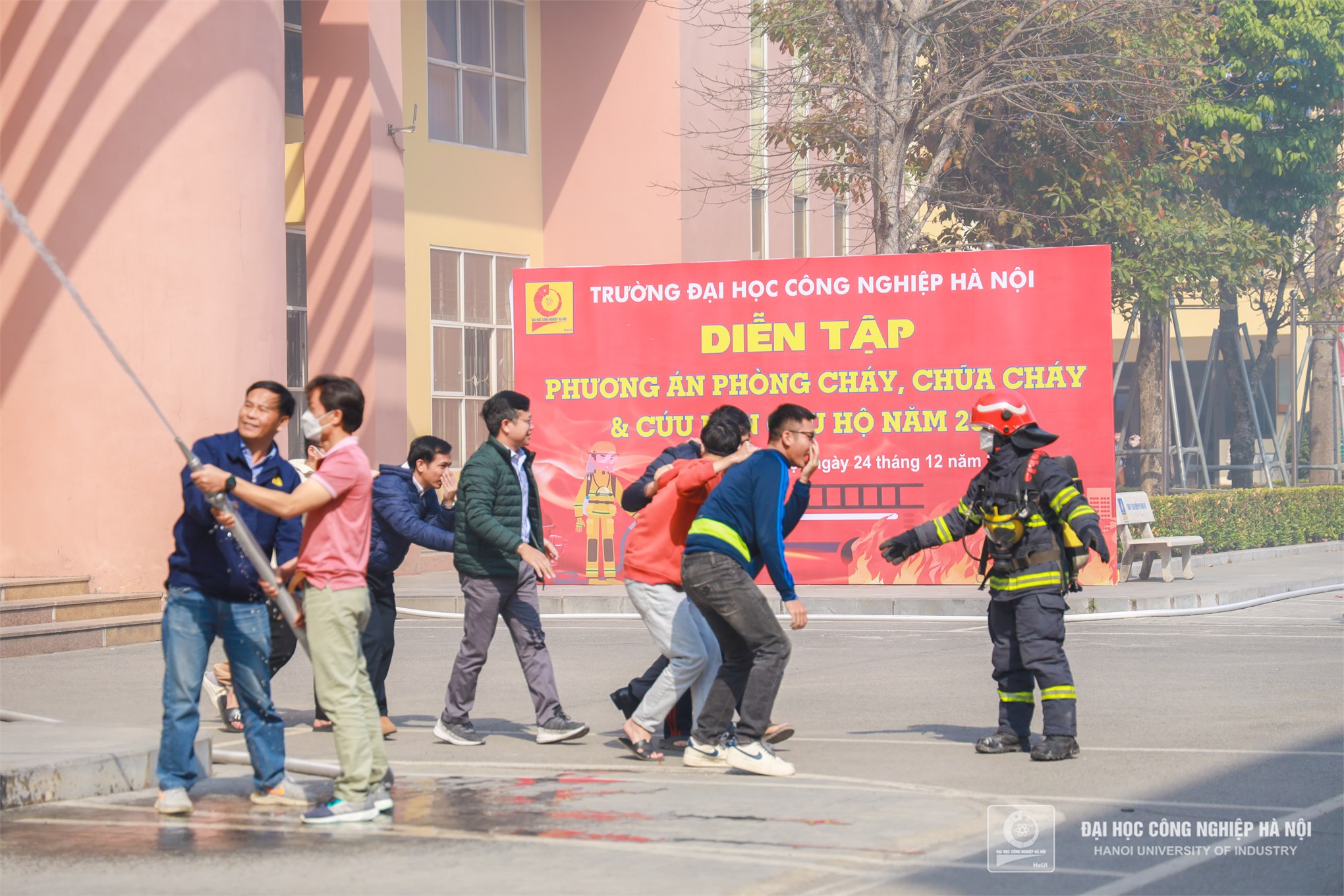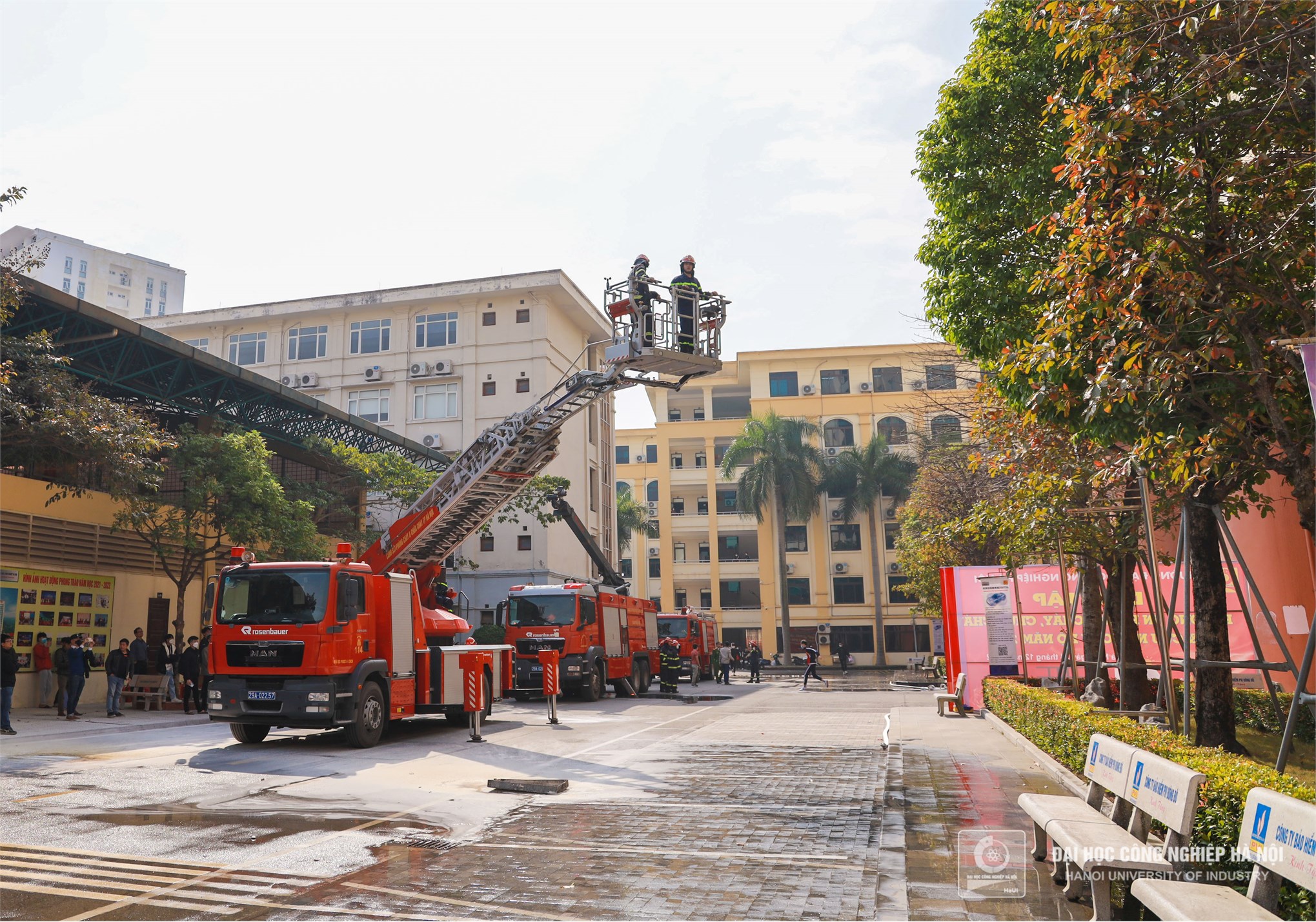 Phần quan trọng của buổi tập huấn đó là diễn tập thực tiễn công tác phòng cháy chữa cháy. Cán bộ, giảng viên, sinh viên được tham gia diễn tập, sử dụng bình khí, bình bọt, diễn tập tình huống giả định thực tiễn có sự tham gia của lực lượng Phòng cháy chữa cháy công an Quận Bắc Từ Liêm.