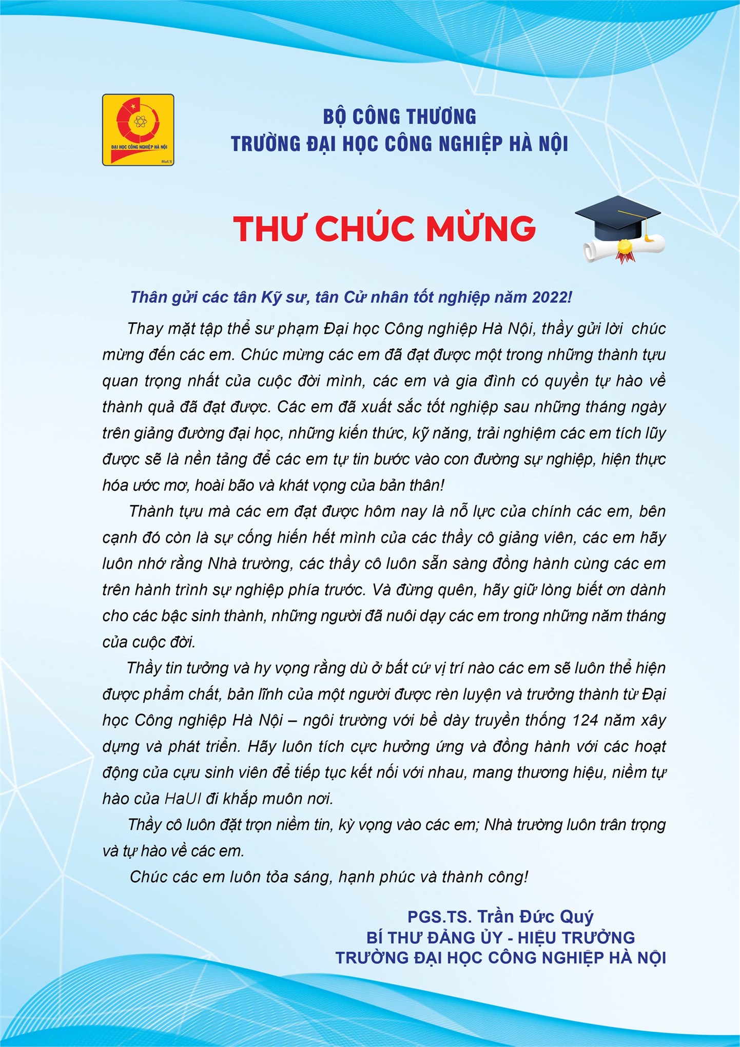 Thư chúc mừng tân cử nhân, tân kỹ sư năm 2022 của Hiệu trưởng