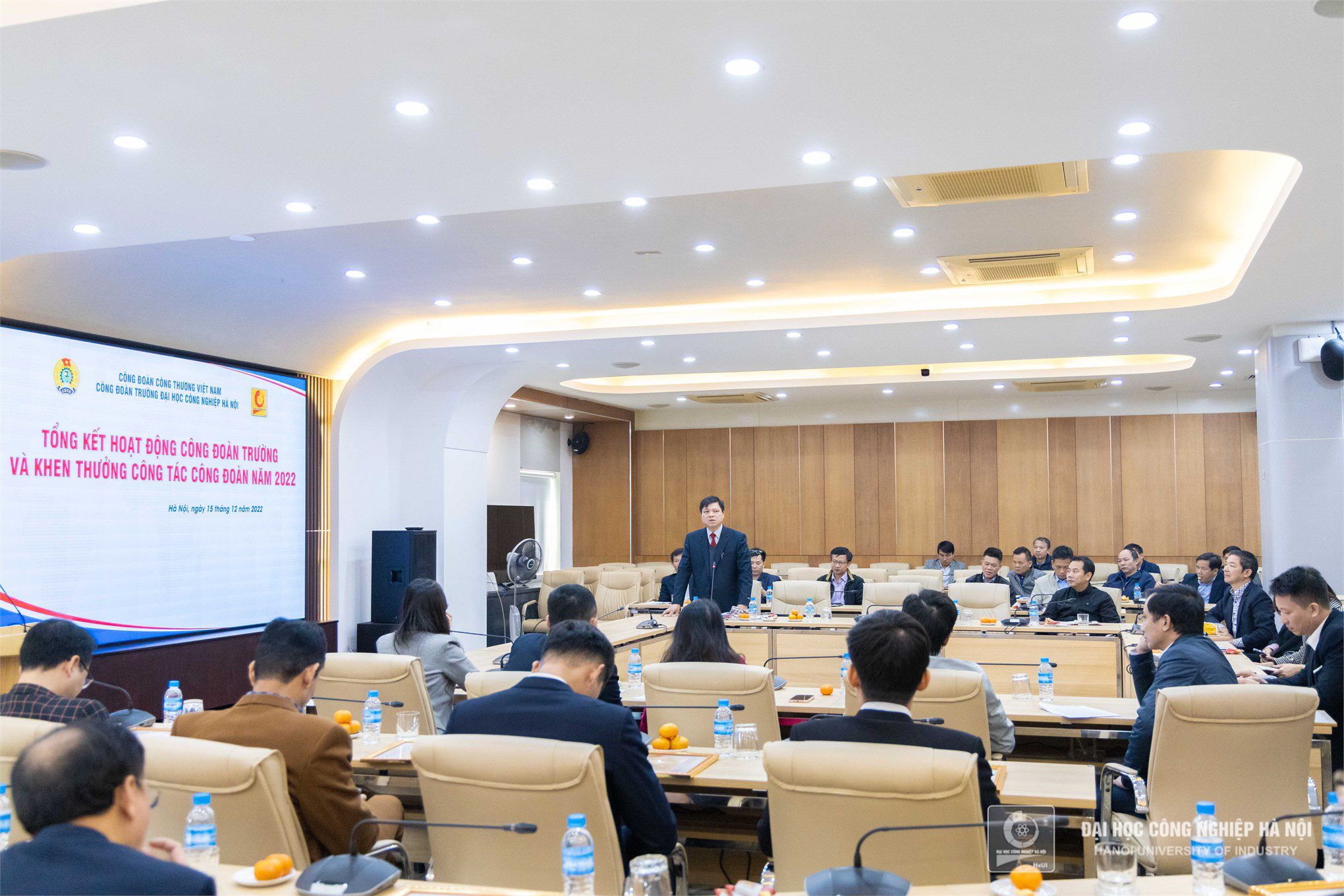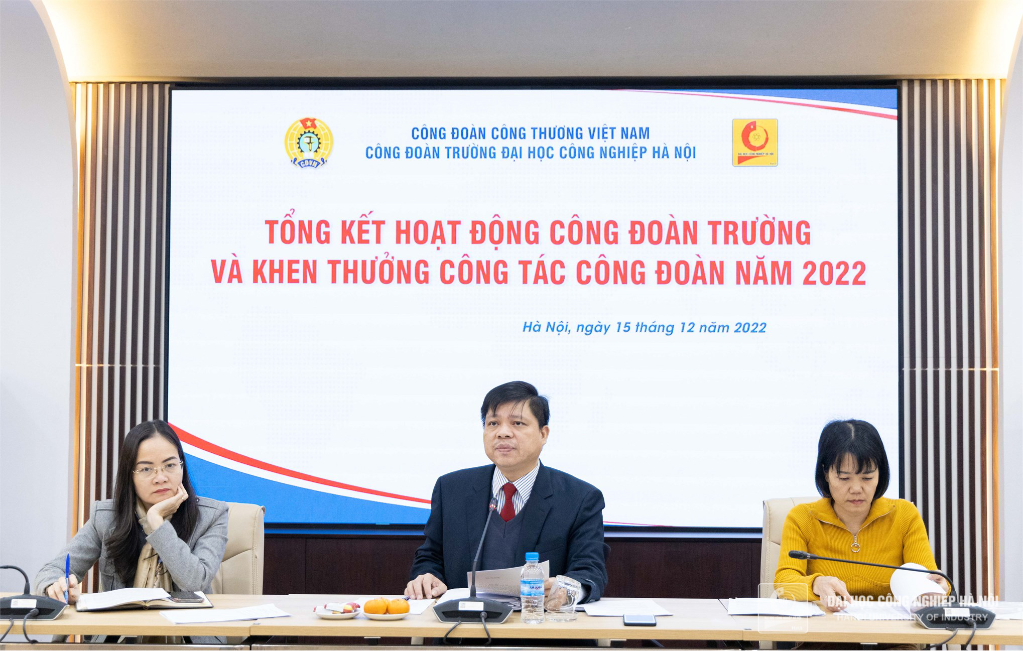 Hội nghị đã nghe PGS.TS. Phạm Văn Đông - Chủ tịch Công đoàn Trường trình bày Báo cáo tổng kết công tác công đoàn năm 2022 và phương hướng công tác năm 2023. Về cơ bản những mục tiêu, nhiệm vụ đặt ra trong kế hoạch năm 2022 của Công đoàn Trường đã được triển khai thực hiện thành công: Công đoàn Trường cũng đã phối hợp với Chính quyền thực hiện nhiệm vụ tuyển sinh, đào tạo năm học 2021 -2022; tham gia góp ý, xây dựng và triển khai thực hiện các quy định như Quy chế làm việc, Quy chế chi tiêu nội bộ của Nhà trường, Quy chế chi tiêu Công đoàn Trường và các quy định nội bộ khác.