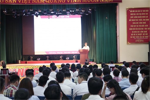 PGS.TS Vũ Minh Tân - Phó Trưởng phòng KHCN trình bày báo cáo tổng kết hoạt động NCKH trong sinh viên năm học 2017 - 2018 và phát động sinh viên NCKH năm học 2018 - 2019. Năm học 2017 - 2018 đã thu hút được đông đảo sinh viên tham gia với 121 đề tài được đăng ký, trong đó có 95 đề tài đã bảo vệ thành công. Các đề tài đều mang tính ứng dụng cao, giải quyết những vấn đề thiết thực trong thực tiễn; nhiều đề tài thuộc các lĩnh vực có thế mạnh trong nghiên cứu như: Công nghệ hóa học; Môi trường với 28 đề tài, Cơ khí; Ô tô với 26 đề tài, Điện; Điện tử với 21 đề tài…Đặc biệt, năm học 2017 - 2018: 4 đội Robocon của Trường tham dự vòng chung kết cuộc thi Robocon toàn quốc; Sinh viên Khoa Công nghệ Ô tô đạt giải Nhất toàn quốc tại cuộc thi "Lái xe sinh thái tiết kiệm nhiên liệu", các đội tuyển tham gia Olympic toàn quốc các môn: Cơ học, Toán học, Hóa học và thi tay nghề đều đạt thành tích cao.