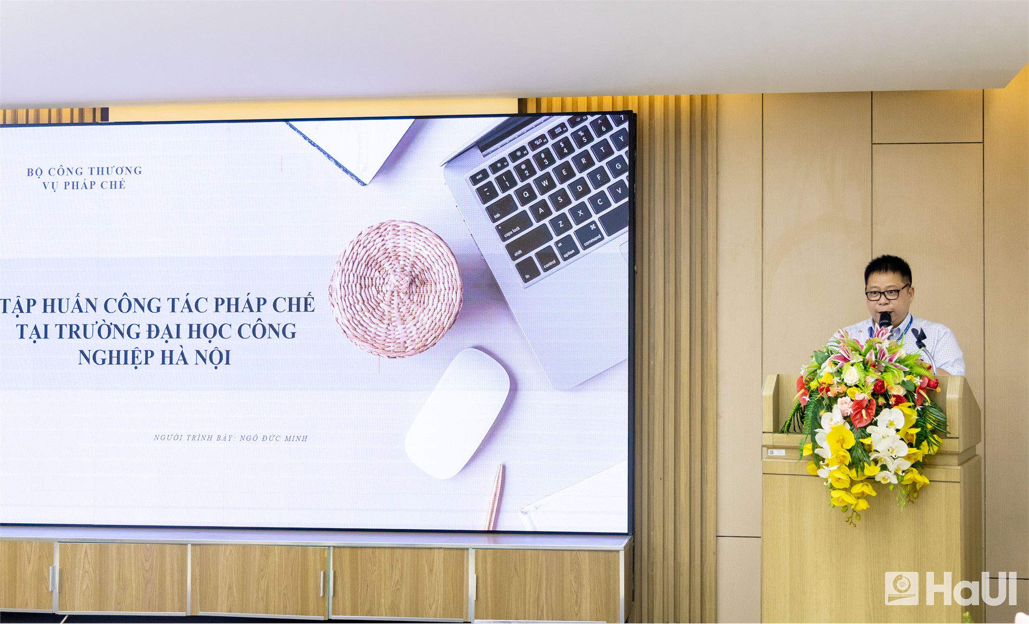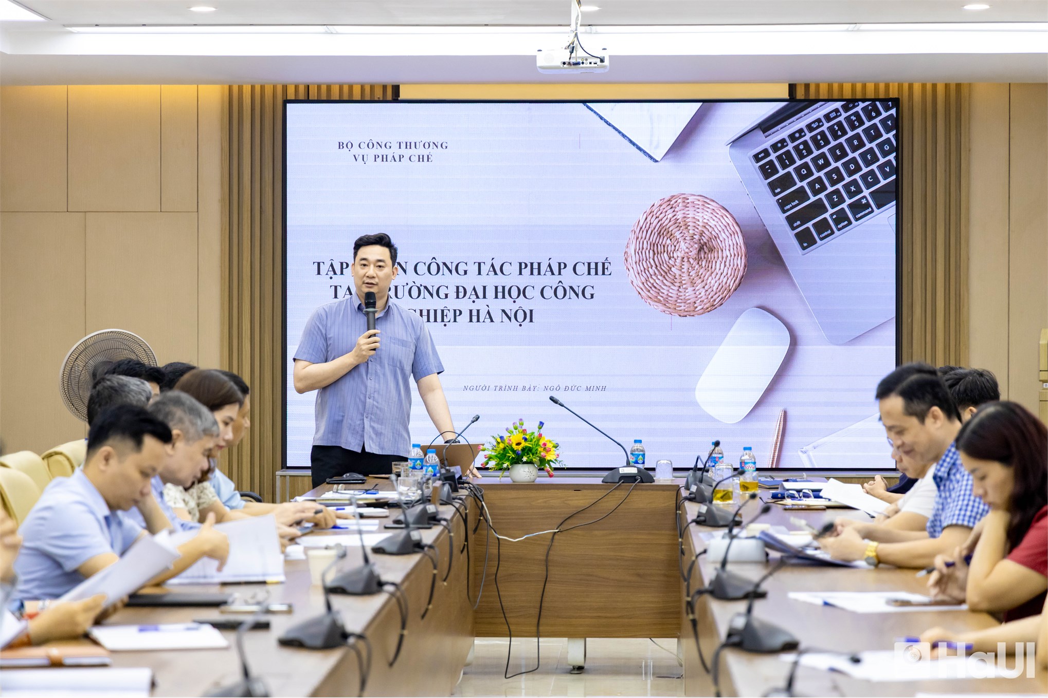 Ông Ngô Đức Minh - Vụ trưởng Vụ Pháp chế, Bộ Công Thương trình bày chuyên đề “Công tác pháp chế tại Trường Đại học Công nghiệp Hà Nội”
