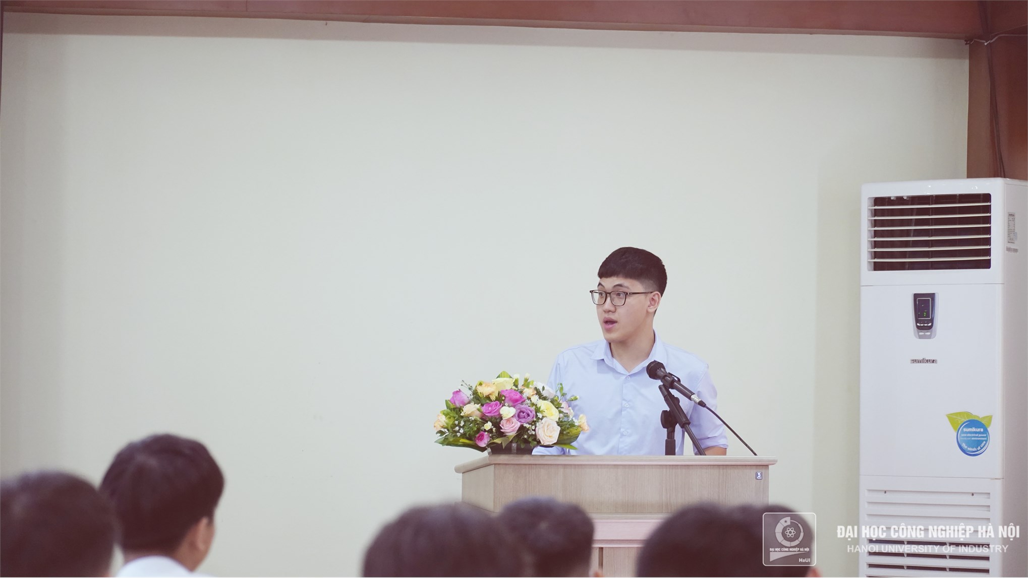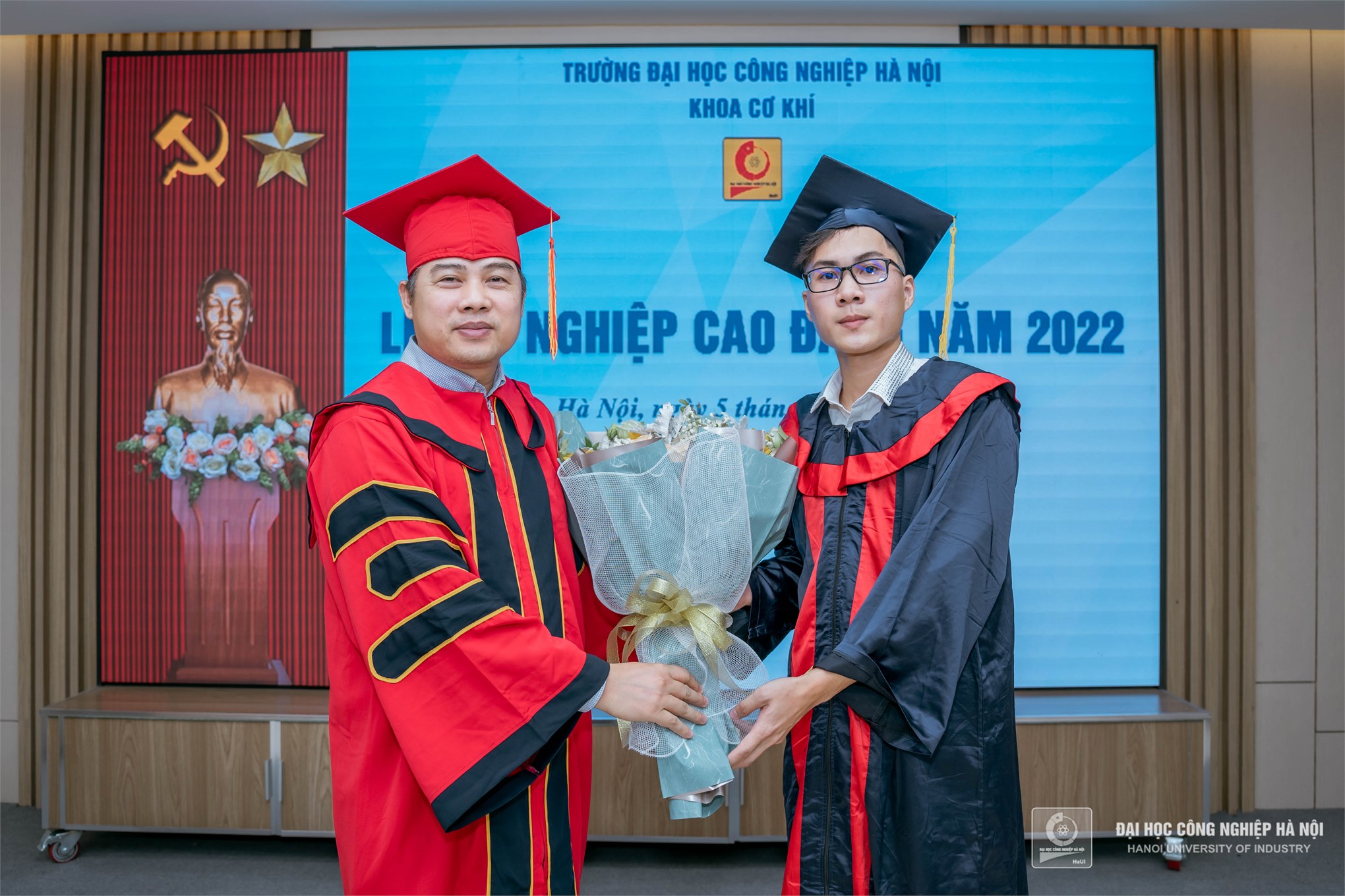Thay mặt cho 102 sinh viên tốt nghiệp đợt này, sinh viên Nguyễn Hữu Mạnh lớp Cơ điện tử 3- K21 phát biểu tri ân và tặng hoa thầy cô trong lễ tốt nghiệp. Hữu Mạnh chia sẻ: Thay mặt các bạn sinh viên, em xin gửi lời cảm ơn chân thành đến thầy cô giáo trong khoa, đã luôn giúp đỡ, đồng hành và tạo mọi điều kiện tốt nhất cho chúng em trong học tập. Em rất tự hào về HaUI và hạnh phúc khi đạt được kết quả tốt đẹp hôm nay.