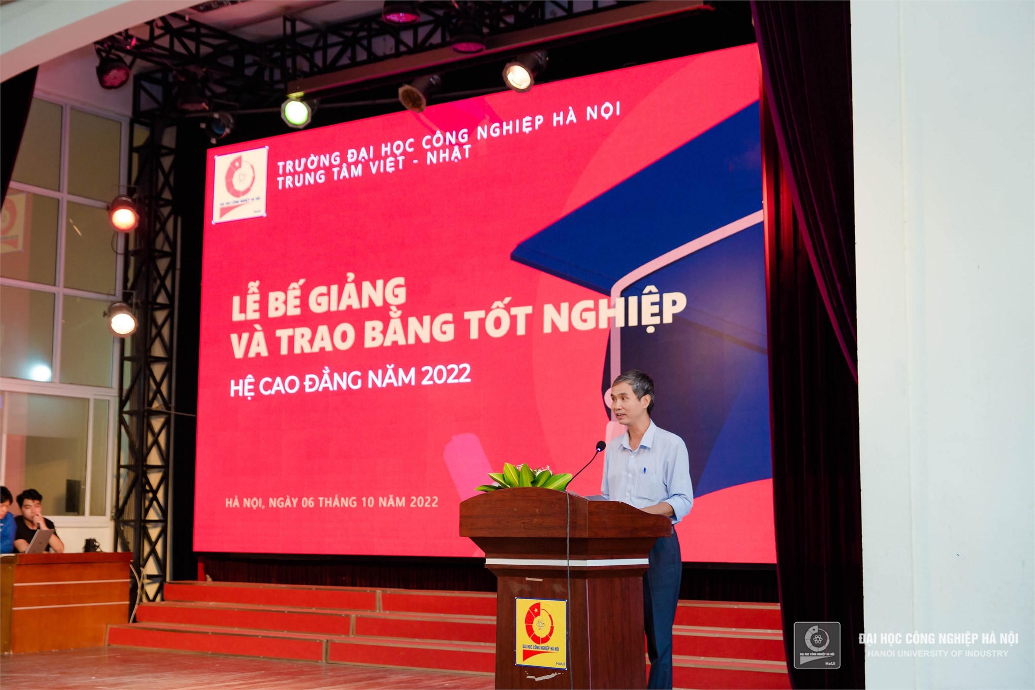 TS. Nguyễn Xuân Chung - Giám đốc Trung tâm Việt nhật phát biểu chúc mừng tại Lễ bế giảng và trao bằng tốt nghiệp cho 179 sinh viên hệ cao đẳng năm 2022