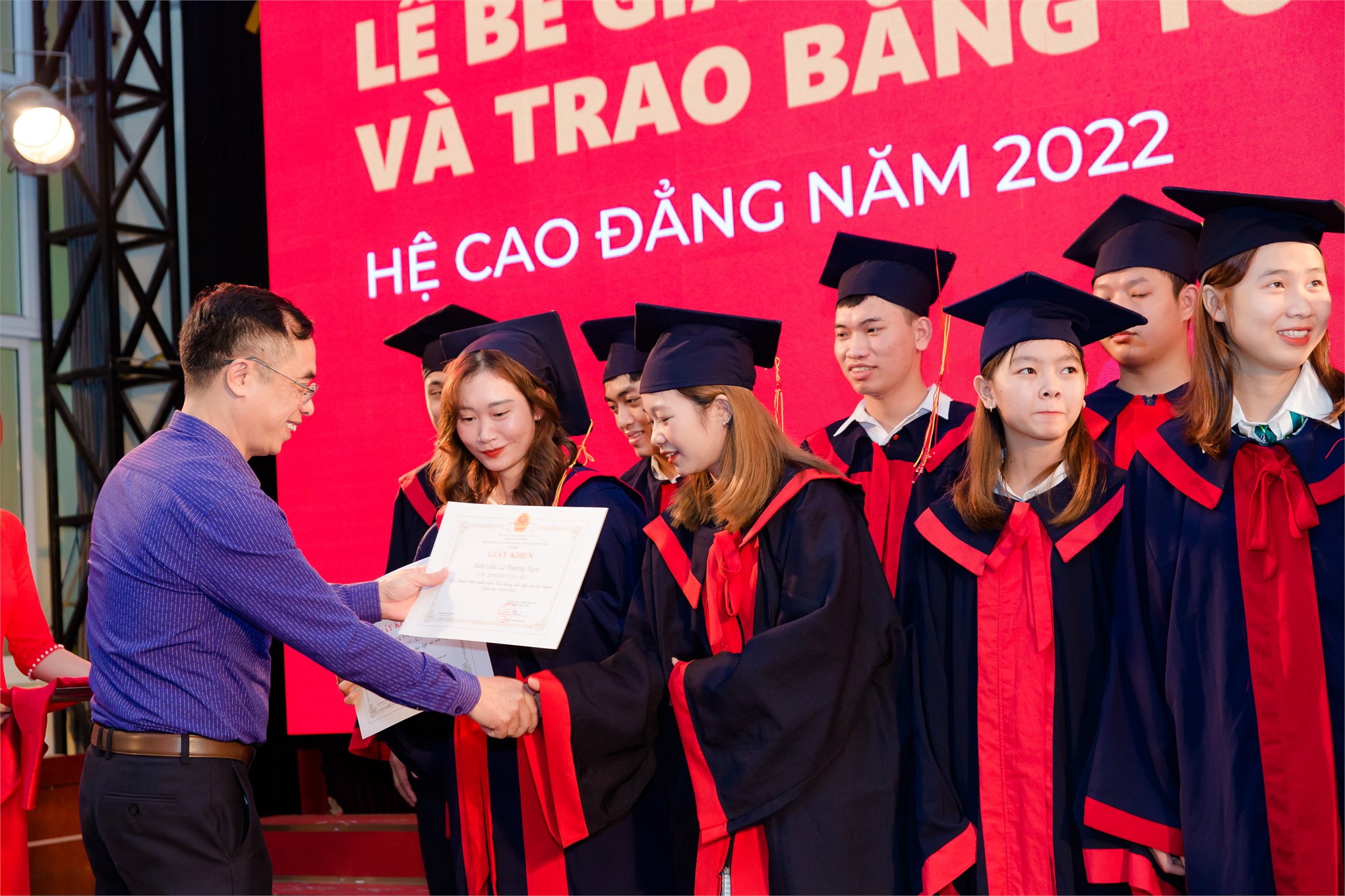 Buổi lễ tốt nghiệp Cao đẳng diễn ra ấm áp, sinh viên háo hức với tấm bằng đỏ trên tay, cùng chụp ảnh lưu niệm với thầy cô trong Khoa