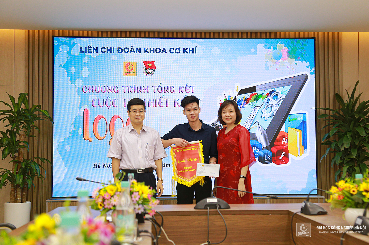 TS. Nguyễn Văn Thiện - Trưởng khoa Cơ khí và TS. Nguyễn Thị Thu Hương - Phó Giám đốc Trung tâm Truyền thông và quan hệ công chúng trao giải Nhất cho bạn Trần Đăng Hùng Long