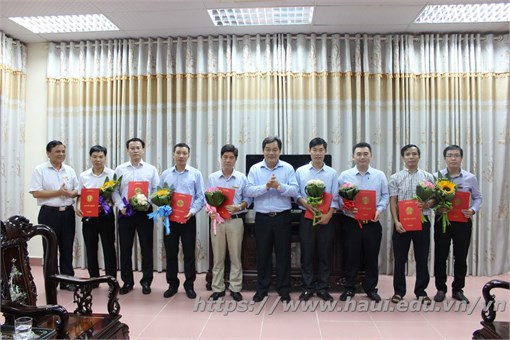 PGS. TS Trần Đức Quý – Bí thư Đảng ủy, Hiệu trưởng Nhà trường trao quyết định bổ nhiệm mới cho 04 Trưởng đơn vị và bổ nhiệm lại 01 trưởng đơn vị, đồng thời trao quyết định điều chuyển và bổ nhiệm cho 06 cán bộ cấp phó trưởng đơn vị; bổ nhiệm mới 02 cán bộ cấp phó trưởng đơn vị.