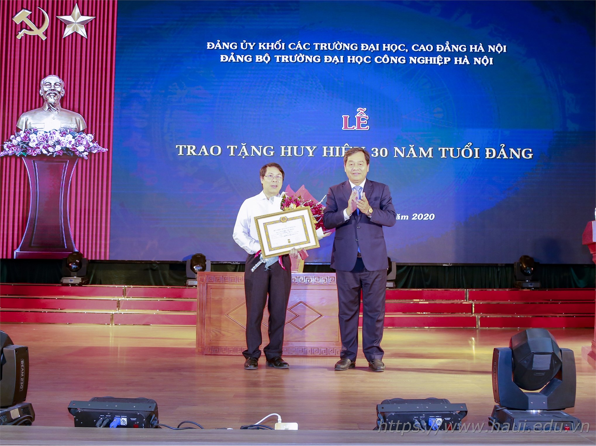 Tại buổi Lễ, đồng chí Trần Đức Quý - Bí thư Đảng ủy, Hiệu trưởng nhà trường trao tặng Huy hiệu 30 năm tuổi Đảng cho đồng chí Nguyễn Văn Thắng - Phó Trưởng khoa Công nghệ Thông tin.
