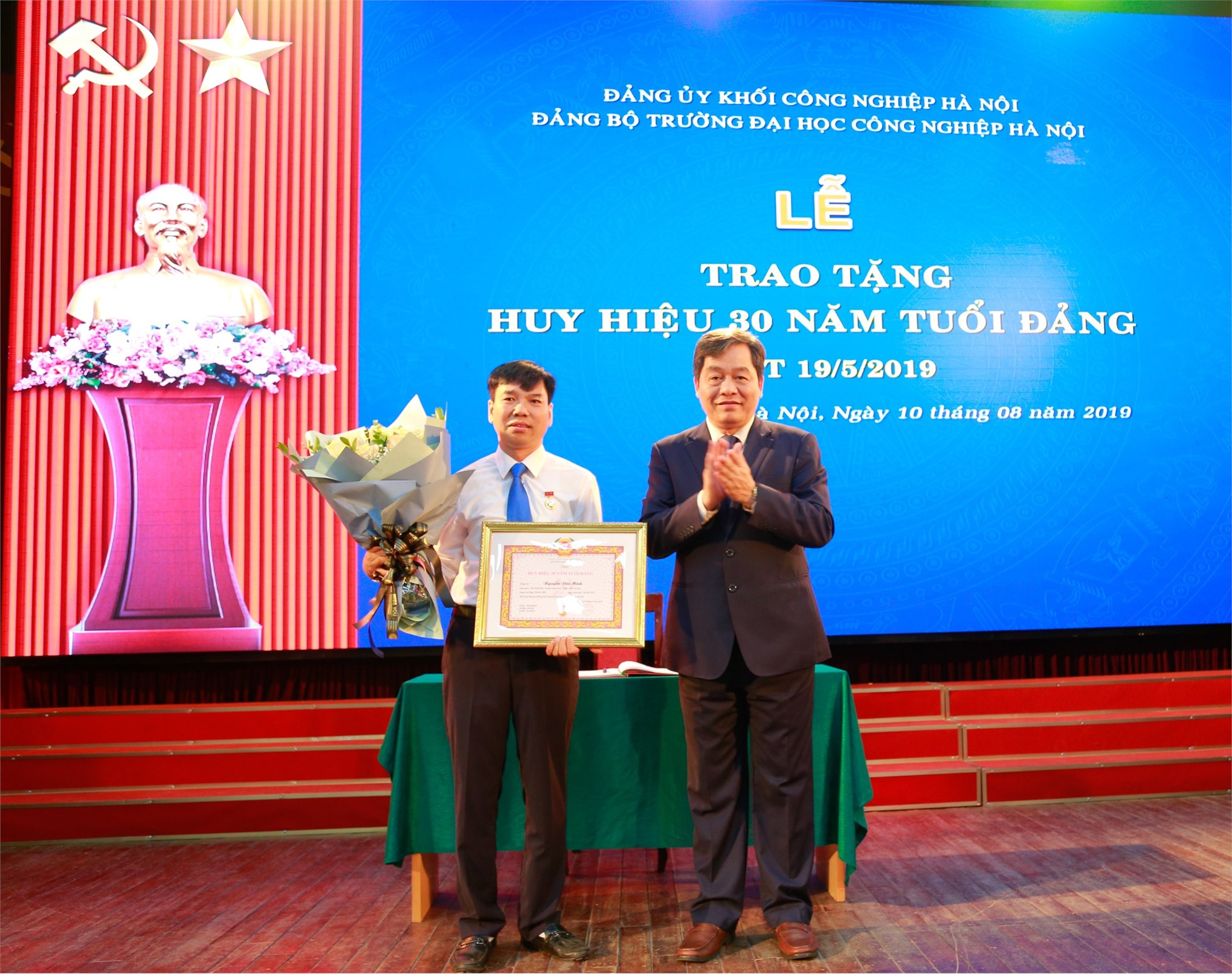 Tại buổi Lễ, đồng chí Trần Đức Quý, Ủy viên Ban thường vụ Đảng ủy Khối Công nghiệp Hà Nội, Bí thư Đảng ủy, Hiệu trưởng Nhà trường trao tặng Huy hiệu 30 năm tuổi Đảng cho đồng chí Nguyễn Đức Minh - Phó Giám đốc Trung tâm Truyền thông và Quan hệ Công chúng.