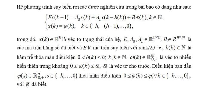 Thứ hai, trong trường hợp hệ suy biến có sự tham gia của nhiễu (nhiễu bị chặn), bài báo đưa ra điều kiện đủ đảm bảo trạng thái của hệ bị chặn theo tọa độ. Các điều kiện được đưa ra dưới dạng bán kính phổ của các ma trận, những điều kiện này có thể dễ dàng kiểm tra thông qua các gói công cụ trong phần mềm Matlab và cho phép ta tính toán được cận trên nhỏ nhất của từng tọa độ trạng thái của hệ rời rạc suy biến dương có nhiễu.