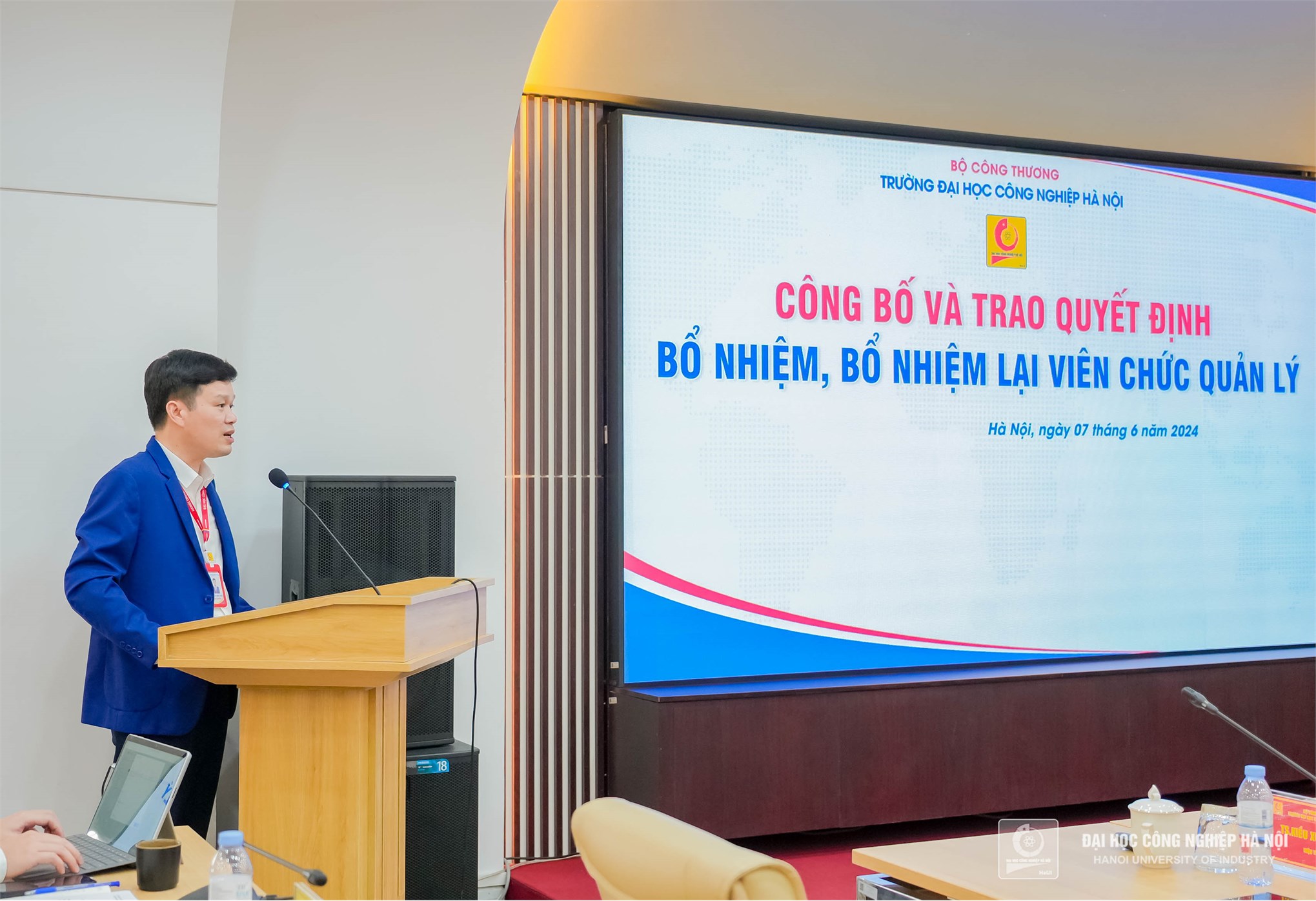 Phát biểu giao nhiệm vụ, TS.Kiều Xuân Thực, Hiệu trưởng Đại học Công nghiệp Hà Nội chúc mừng các cá nhân được lãnh đạo nhà trường, viên chức, người lao động tin tưởng giao nhiệm vụ cán bộ và mong muốn các cán bộ được bổ nhiệm mới, được bổ nhiệm lại tiếp tục nỗ lực, chủ động, sáng tạo, nâng cao hiệu quả quản lý, đoàn kết cùng tập thể hoàn thành xuất sắc nhiệm vụ được giao, đóng góp vào sự phát triển của Đại học Công nghiệp Hà Nội.