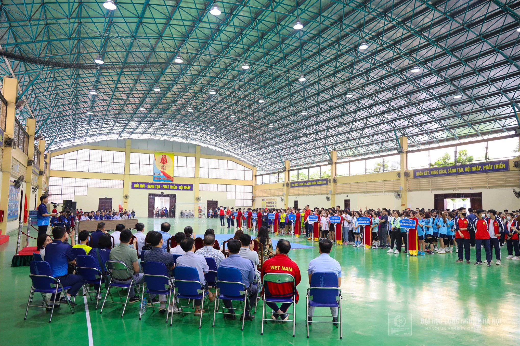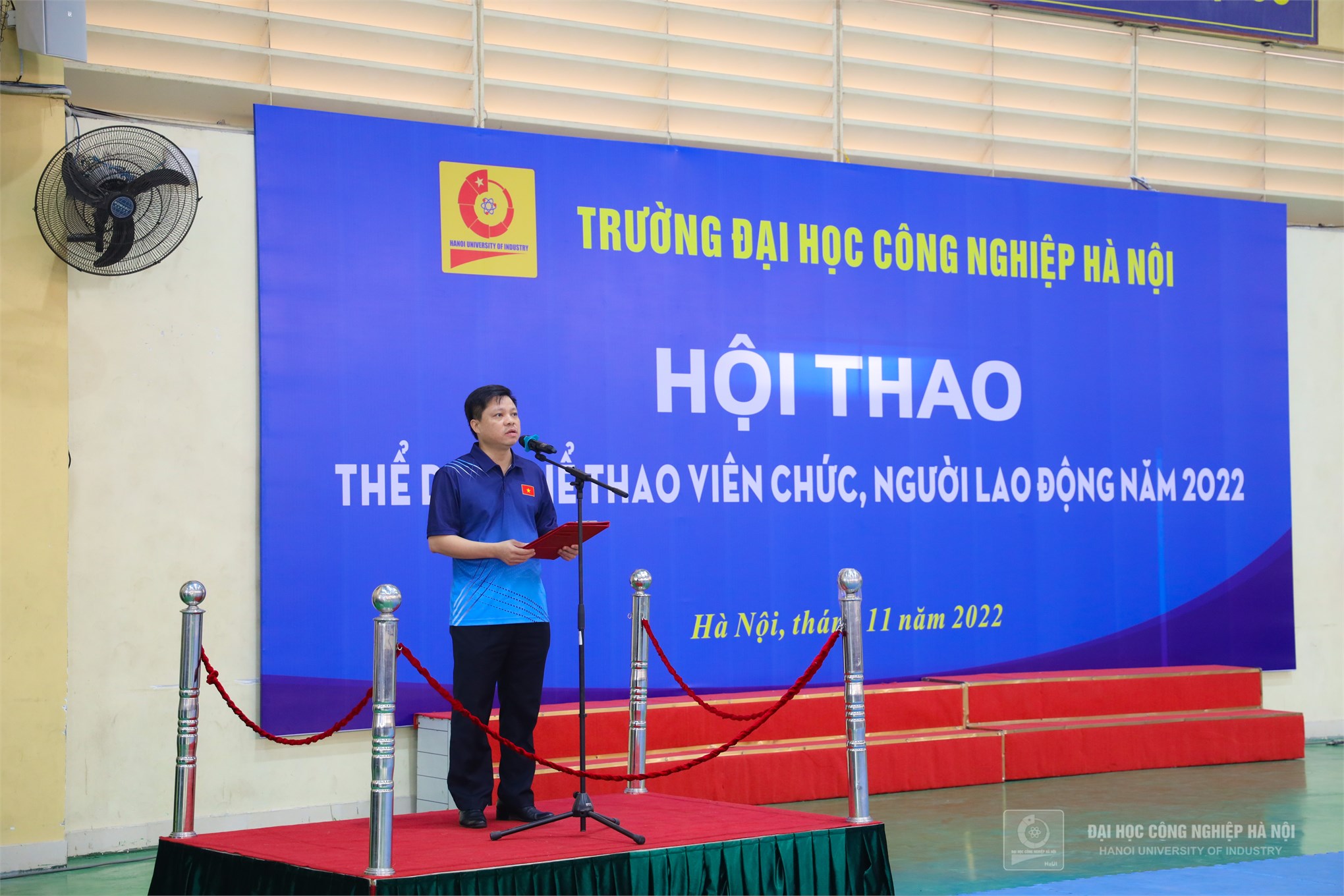 Phát biểu chào mừng, PGS.TS.Phạm Văn Đông – Chủ tịch Công đoàn trường nhấn mạnh: Đảng ủy, Công đoàn, Đoàn Thanh niên nhà trường luôn quan tâm chú trọng, tạo điều kiện, tổ chức và phát động phong trào TDTT trong viên chức, người lao động và sinh viên nhà trường. Phong trào TDTT đã thực sự trở thành sự kiện được hưởng ứng mạnh mẽ, góp phần đẩy mạnh và nâng cao chất lượng phong trào "Toàn dân rèn luyện thân thể theo gương Bác Hồ vĩ đại"; “Khỏe để xây dựng và bảo vệ Tổ quốc”. ĐHCNHN coi sự phát triển thể dục, thể thao là một phương thức hữu hiệu để nâng cao sức khỏe, thể lực và chất lượng nguồn nhân lực, giáo dục ý chí, đạo đức, xây dựng lối sống, môi trường văn hóa lành mạnh, tăng cường khối đại đoàn kết toàn hệ thống nhà trường.