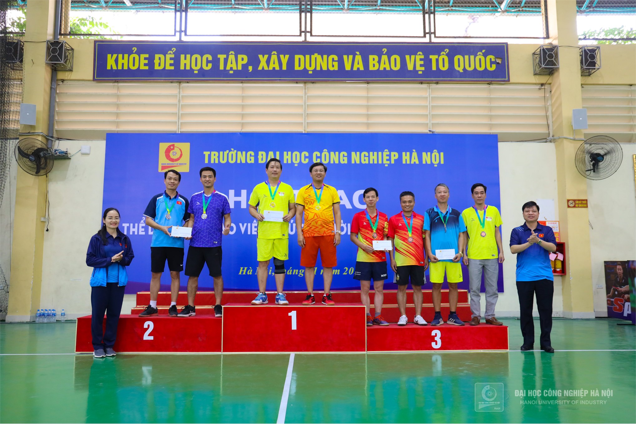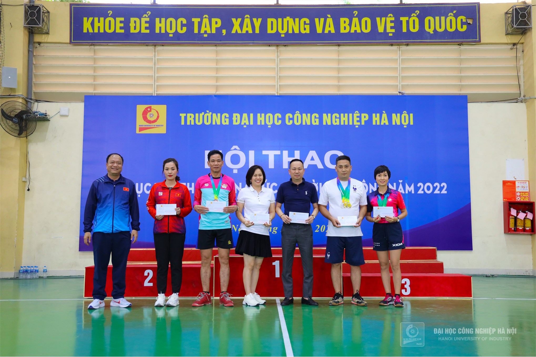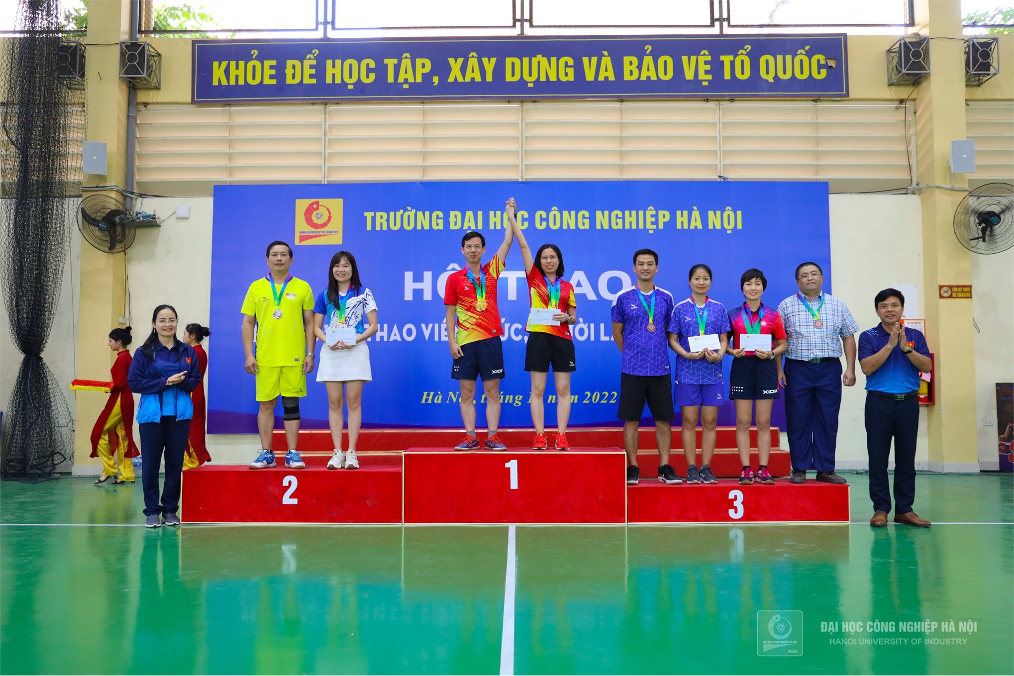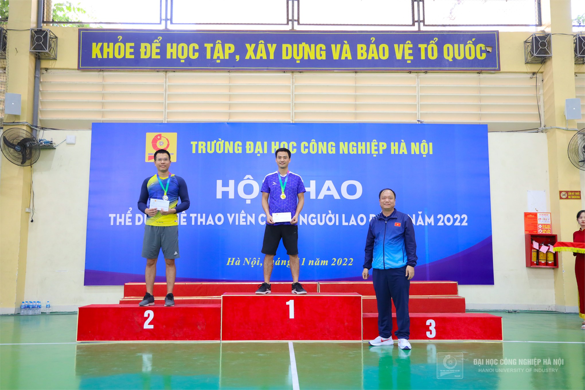 PGS.TS.Phạm Văn Đông - Chủ tịch Công đoàn trường và PGS.TS.Nguyễn Thị Hồng Nga trao giải cho hạng mục đôi nam môn cầu lông