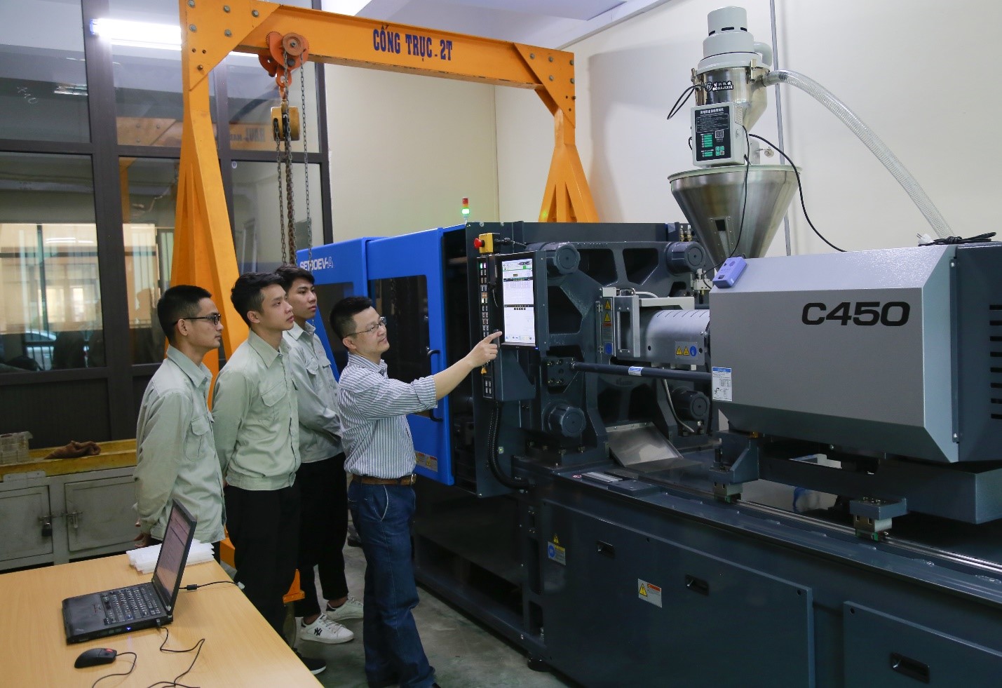 Giảng viên hướng dẫn sinh viên sử dụng máy đúc nhựa SE180EV-A